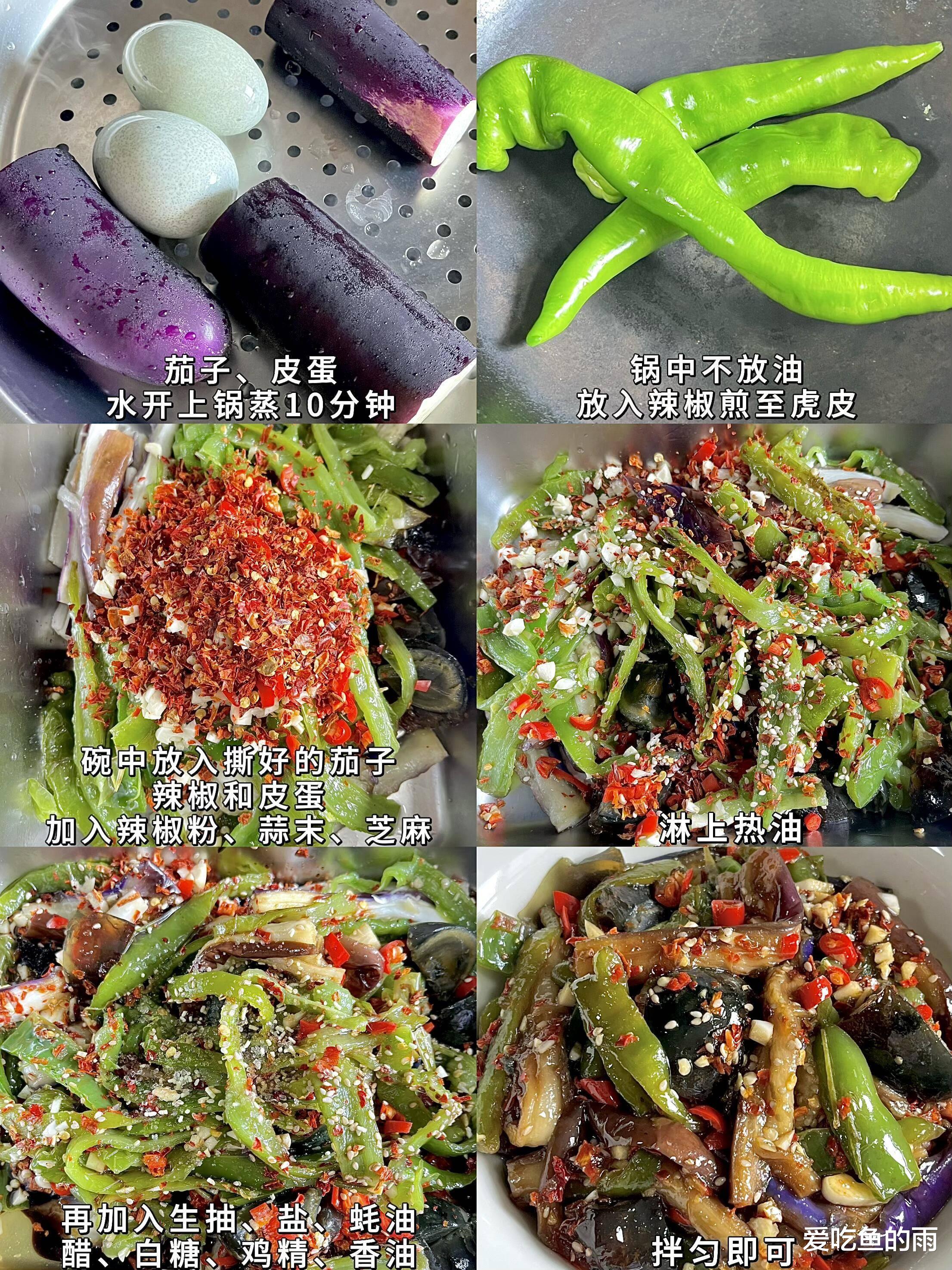 做法简单到偷笑!茄子洗净切段,上锅蒸8分钟,筷子能轻松戳透就关火,放凉后撕成细条挤干水分——这一步是茄子不吸油的关键!接着调灵魂酱汁:两勺生抽、一勺醋、半勺糖、蒜末、小米辣,再淋上热油“滋啦”一声激出香味,最后撒把香菜拌匀。把酱汁倒进茄子里,放上皮蛋块和辣椒圈,戴上手套抓拌均匀,让每根茄子都裹满酱汁,皮蛋的绵密和辣椒的脆爽瞬间融入其中!