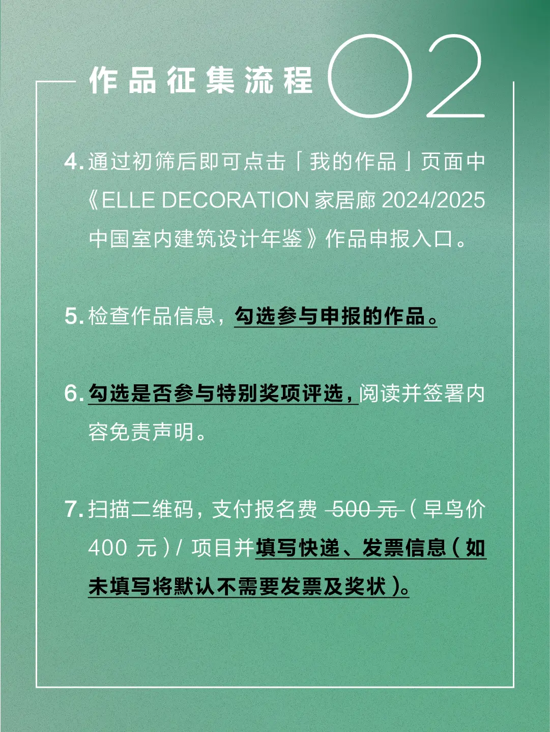 📗《ELLE DECORATION家居廊 2024/2025 中国室内建筑设计年鉴》作品招募于7月25日正式开启,报名即享早鸟优惠。 今年,恰逢DECO创刊20周年,我们以全新矩阵、全新视野、全新机制迎来本期年鉴,作品招募即刻(7月25日)开启,征集落地中国的建筑与室内设计优秀作品,涵盖文化艺术、住宅、酒店、地产、餐饮休闲、商业综合和办公空间七大领域,以前沿灵感启发思考,共赴中国设计的下一个20年。