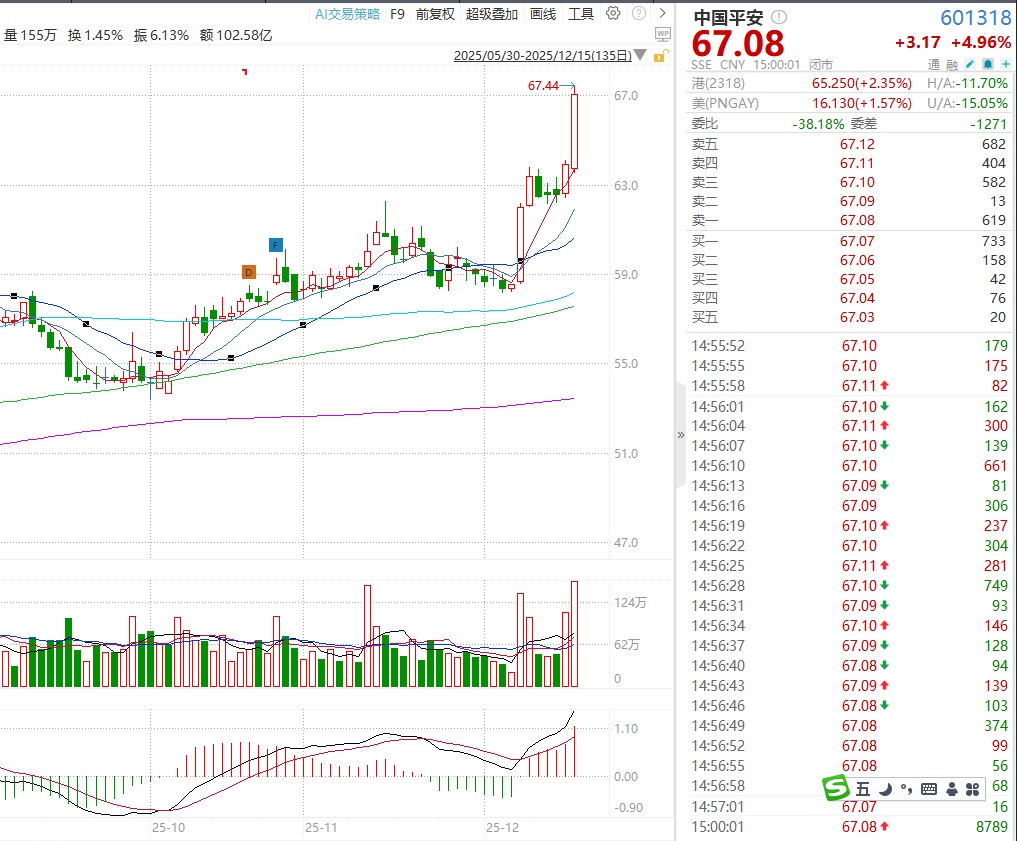 截至收盘,中国平安A股报67.08元,大涨4.96%,单日成交额高达103亿元;H股亦上涨2.51%。这是继12月5日单日飙升5.88%之后,中国平安在短期内再次以强劲姿态引领市场,其背后是多重利好因素形成的强大合力。