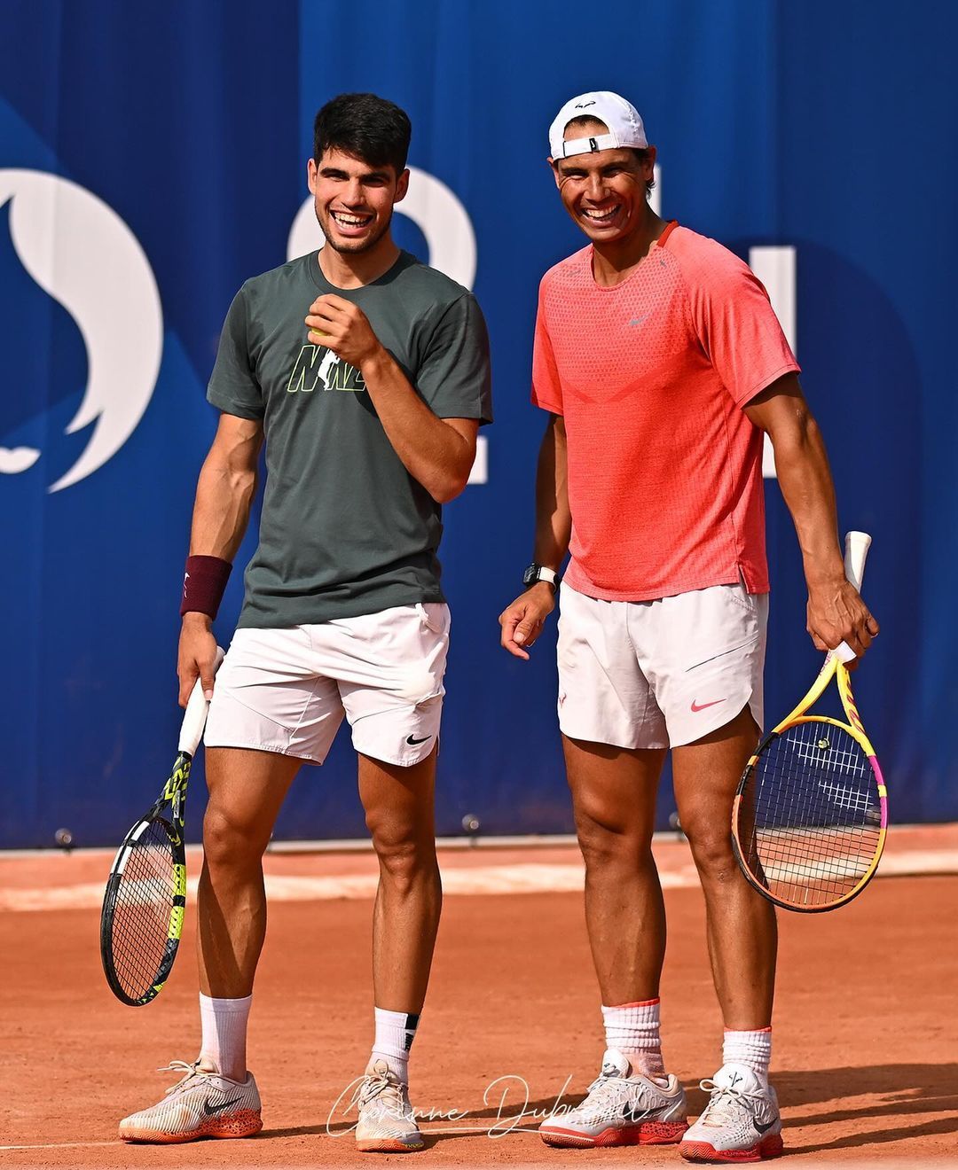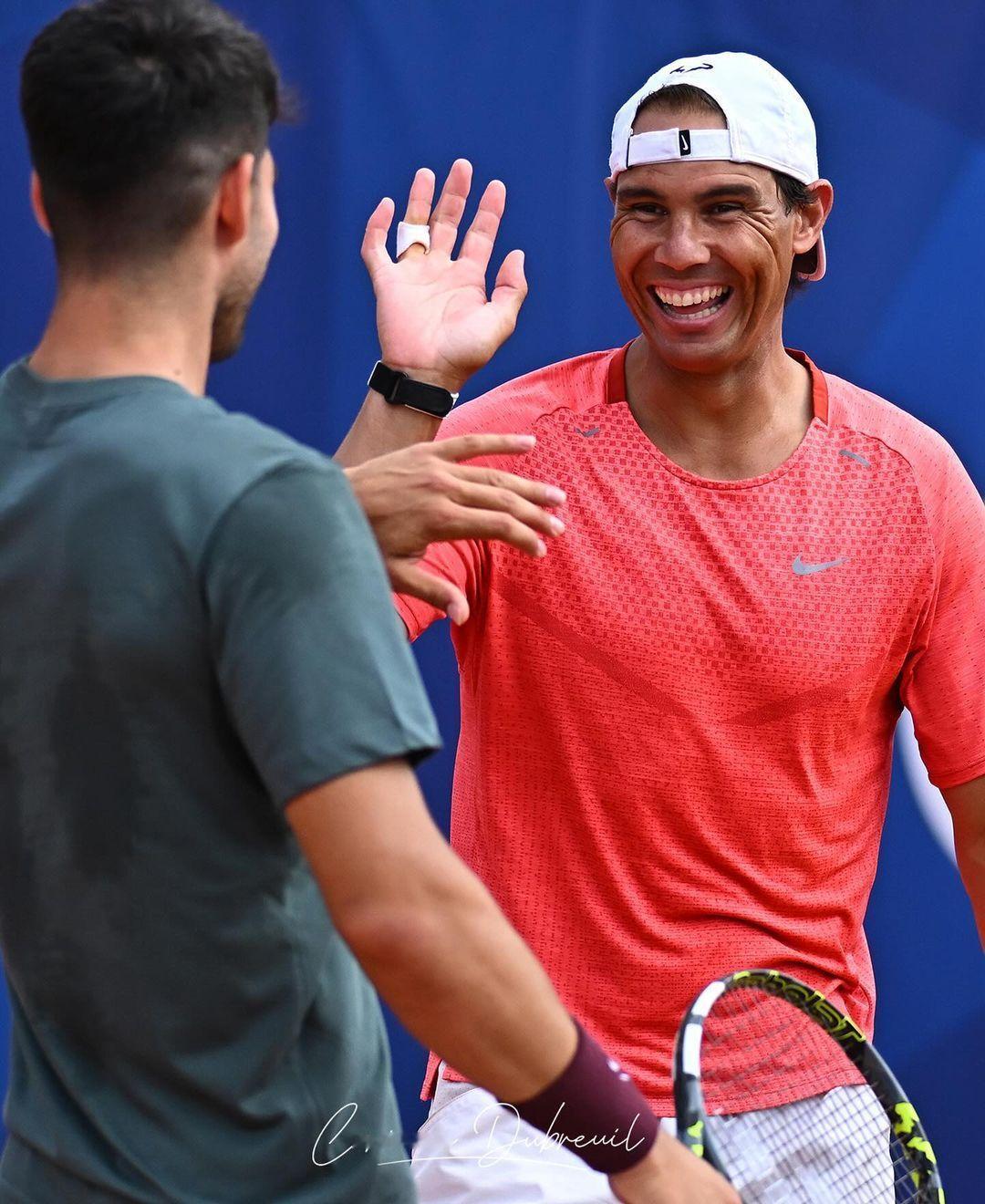 纳达尔和阿尔卡拉斯终于搭档进行双打练习啦,合体训练的美图还是得看摄影师Corin