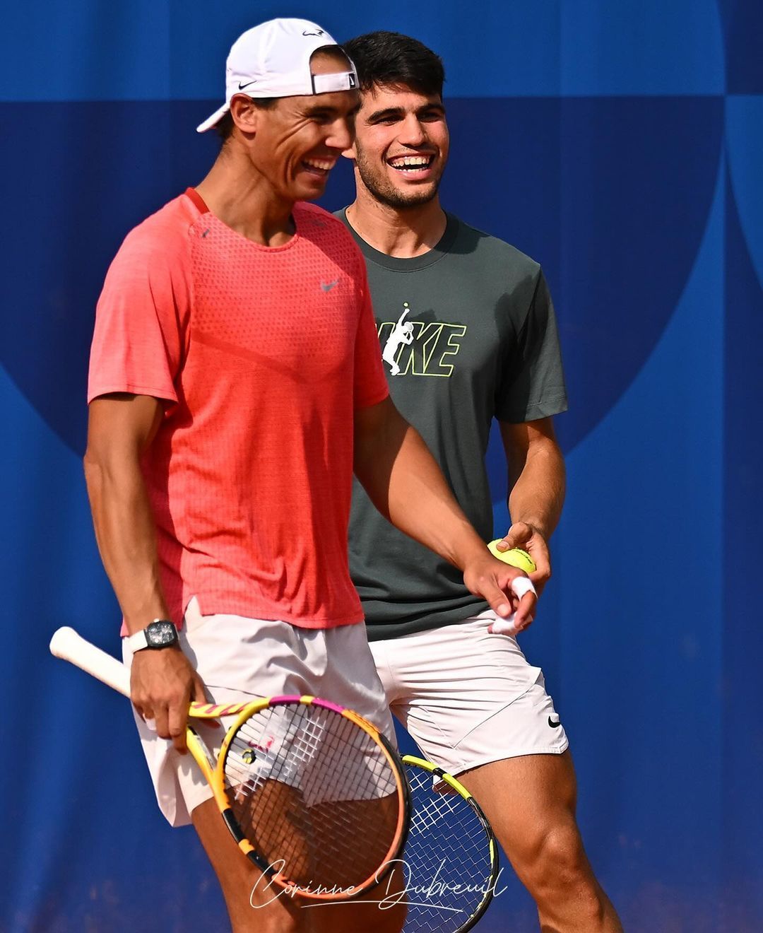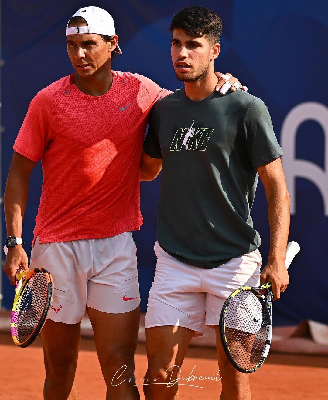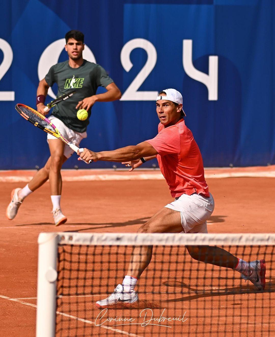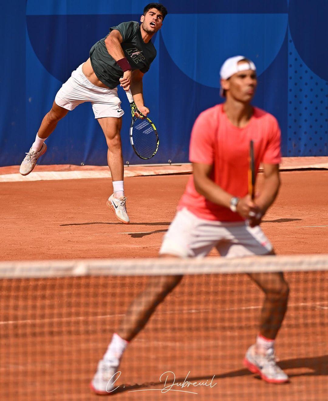 纳达尔和阿尔卡拉斯终于搭档进行双打练习啦,合体训练的美图还是得看摄影师Corinne Dubreuil的镜头,两个人看起来练得很开心呢[嘻嘻]💪🔥#2024年巴黎奥运会#