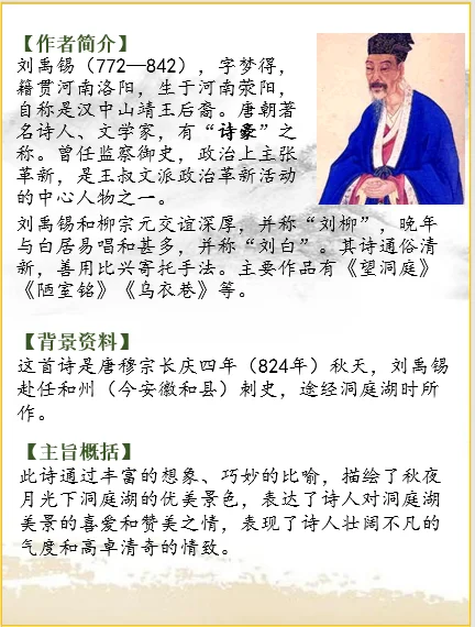 这首诗是唐穆宗长庆四年(824年)秋天,刘禹锡赴任和州(今安徽和县)刺史,途经洞庭湖时所作。