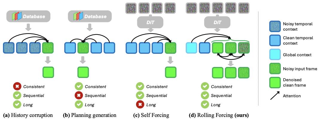 既然现有方法在高质量、一致性和实时性这个困境中难以突破,Rolling Forcing 的动机就很明确: 能否在严格遵守流式顺序的前提下,赋予模型一种「前瞻性」的局部修正能力?其答案是一个巧妙的「滚动窗口」思想。