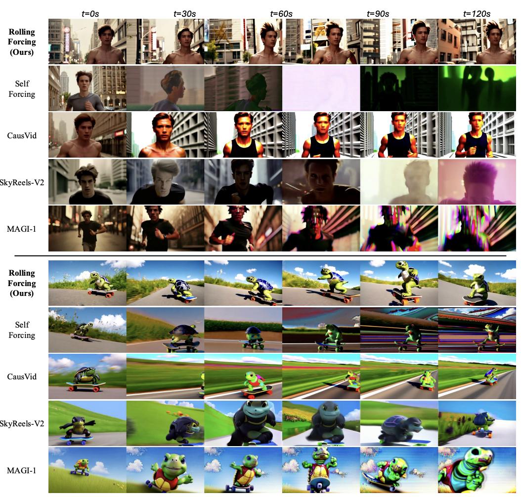 在长视频生成的定性比较中,Rolling Forcing 的优势更为直观。在长达 2 分钟的生成过程中,对比模型(如 SkyReels-V2, MAGI-1 等)出现了明显的颜色偏移、细节退化或主体变形,而 Rolling Forcing 生成的内容在细节、色彩和运动连贯性上均保持了高度稳定。