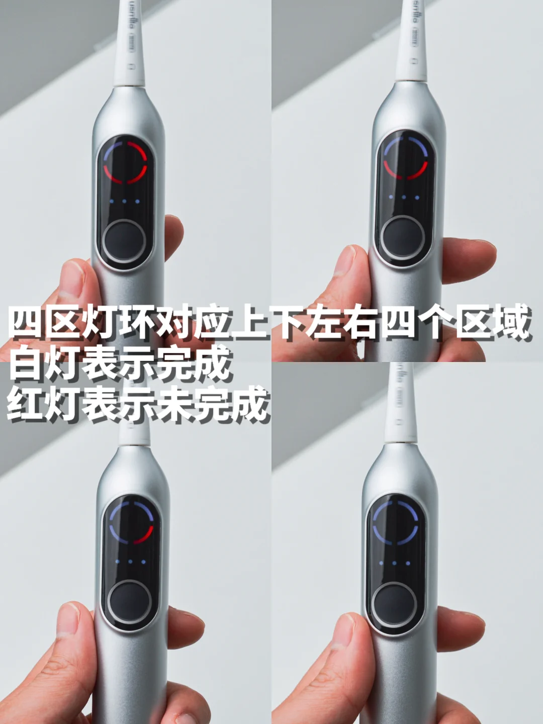 ▫同时它的可视化的小圆屏对应了牙齿的上下左右四个区域,可智能感测已刷完的区域并亮白灯,红灯表示还没刷干净的区域,如果有漏刷还会提醒。