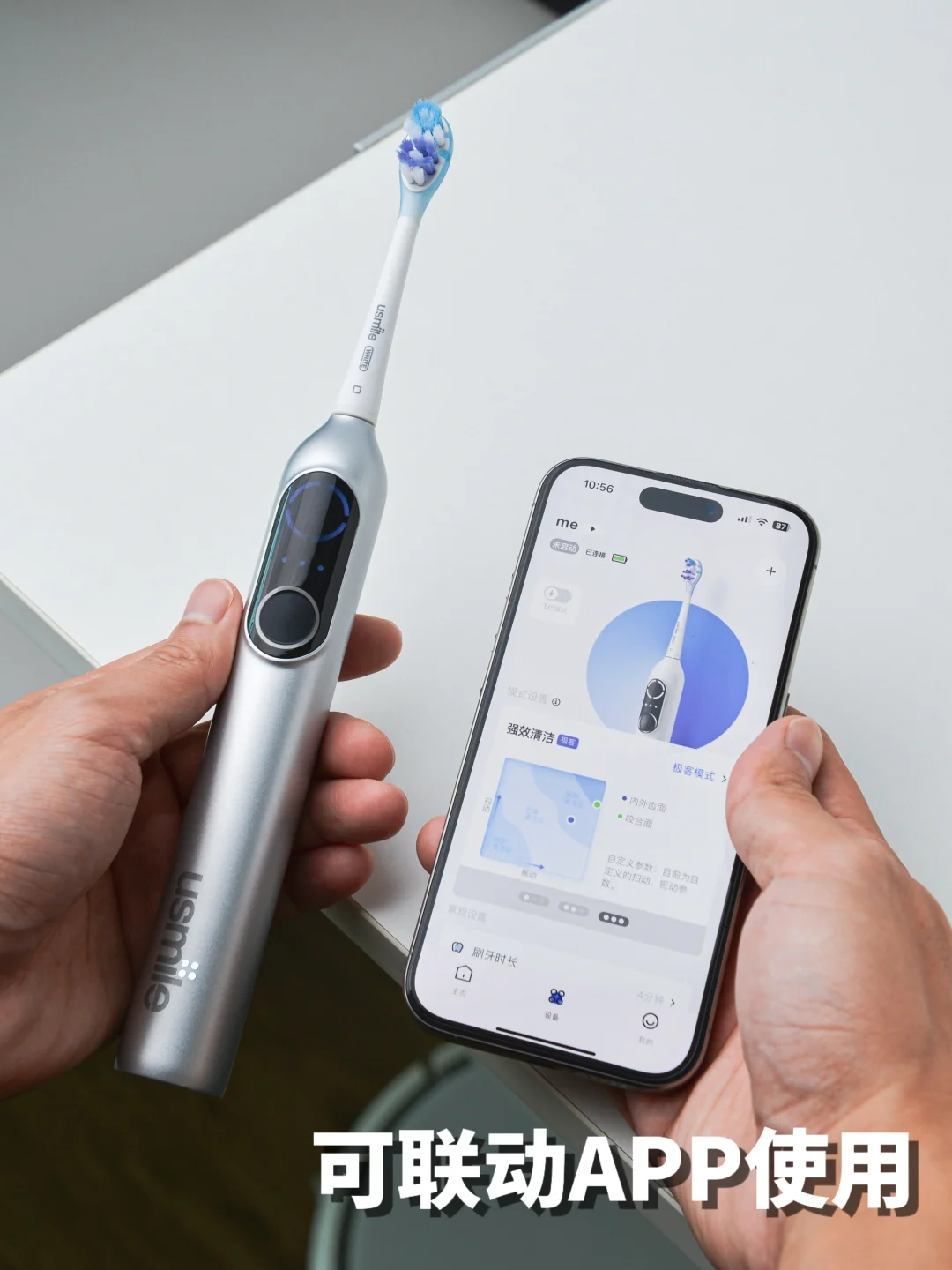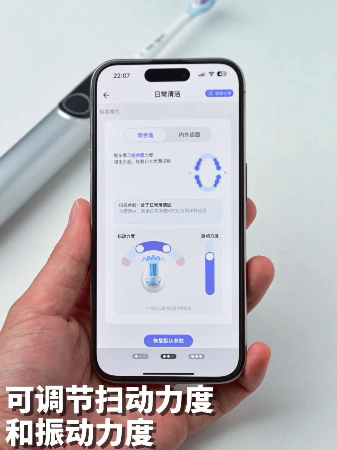 ▫牙刷可以连接APP进行刷牙评估,设置刷牙时常,也可以调整扫动力度和振动力度,同时还可以根据自身的情况独立调整咬合面或内外齿面的参数,颇有科技味!