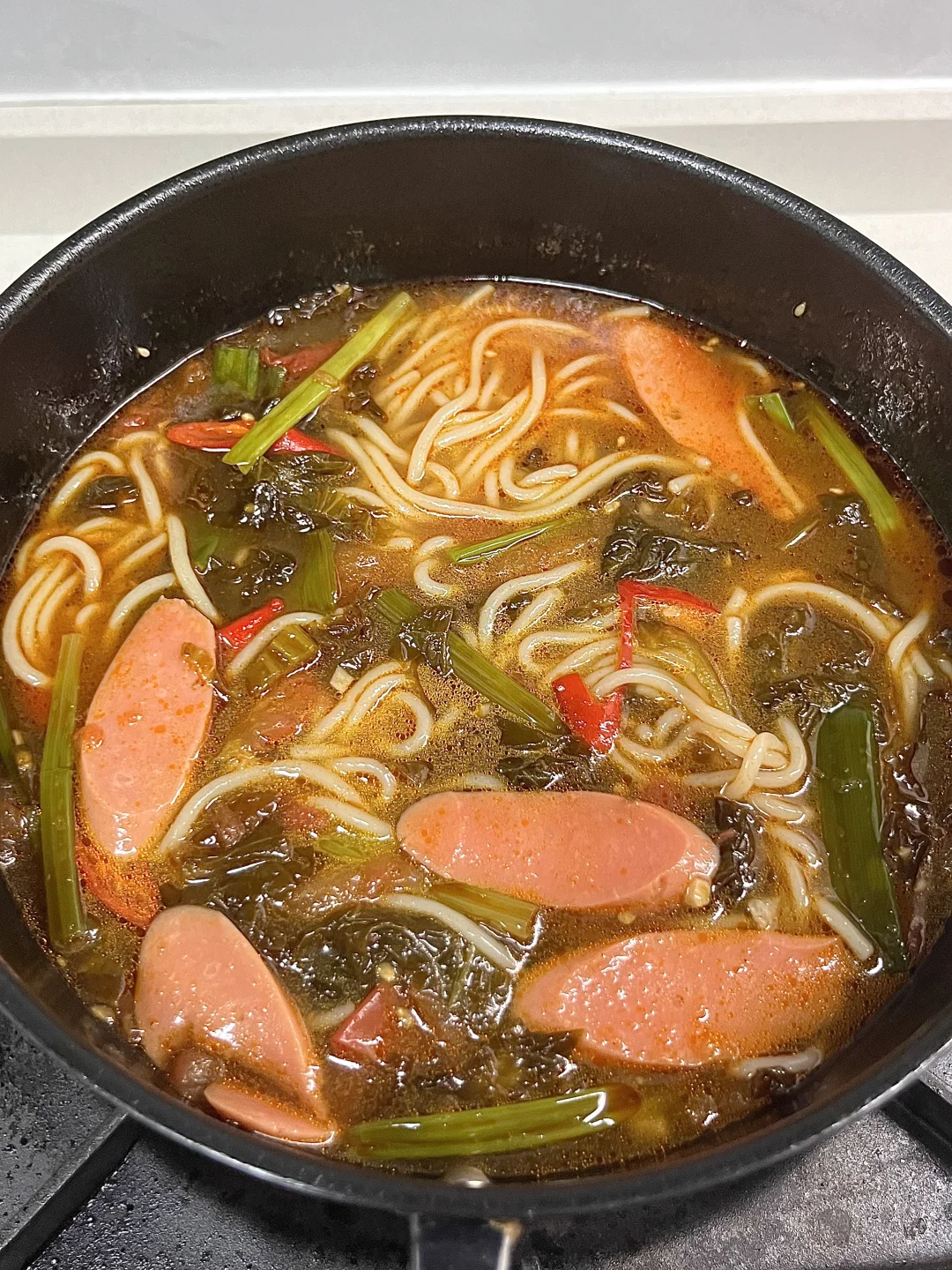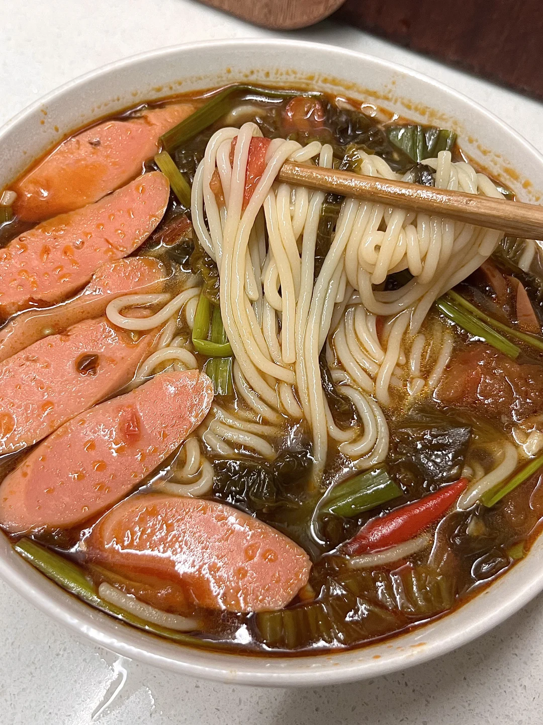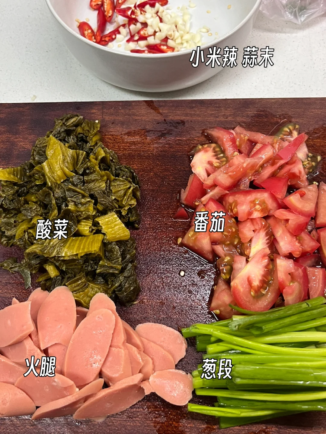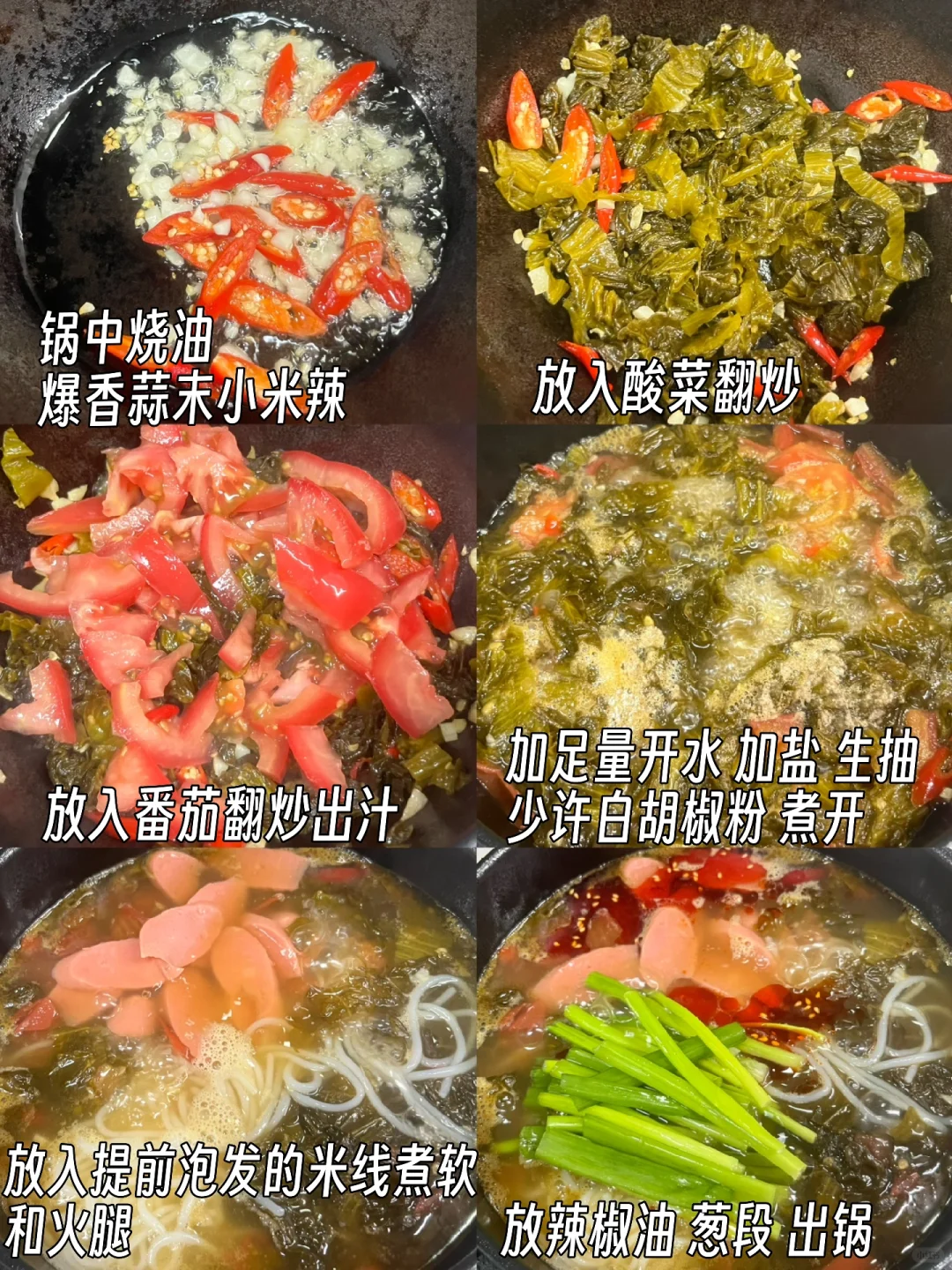 附做法: 1️⃣准备蒜末、小米辣,酸菜、番茄切碎,火腿切片,小葱切段 2️⃣锅中烧油,爆香蒜末、小米辣,放入酸菜翻炒,再放入番茄翻炒出汁 3️⃣加入足量开水,放入生抽、盐、少许白胡椒粉煮开,放入提前泡发的米线和火腿炖煮软 4️⃣放入辣椒油、葱段,出锅✅ -