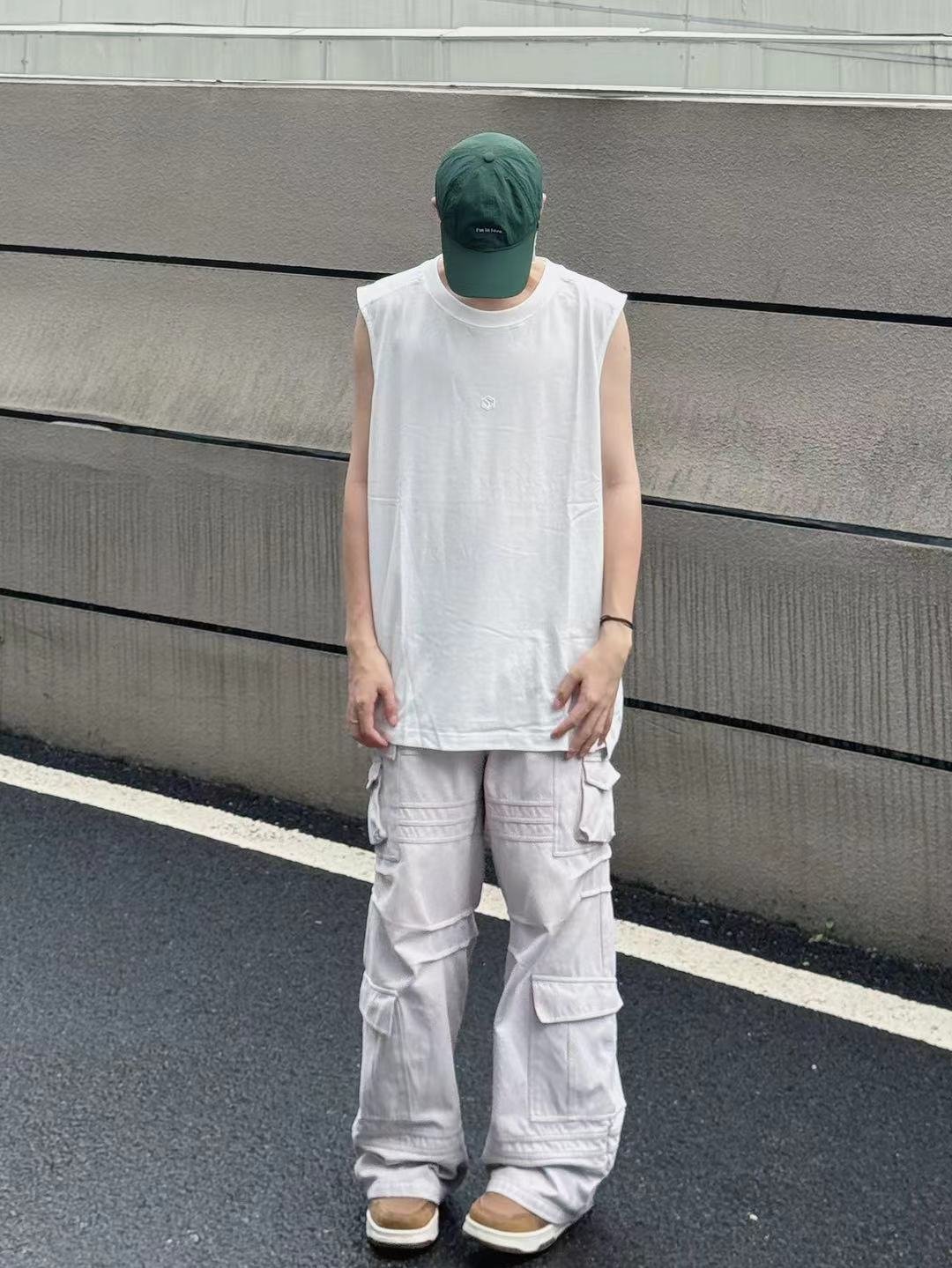 夏日无袖背心get~ 纯白配色很干净,简单但又不缺设计点! 螺纹圆领和后领织带细节满满! 下摆斜切开设计,让简单的背心造型增加不少层次感! 搭配上工装裤或者牛仔裤,轻松拿捏户外街头风! (๑•̀ㅂ•́)و✧