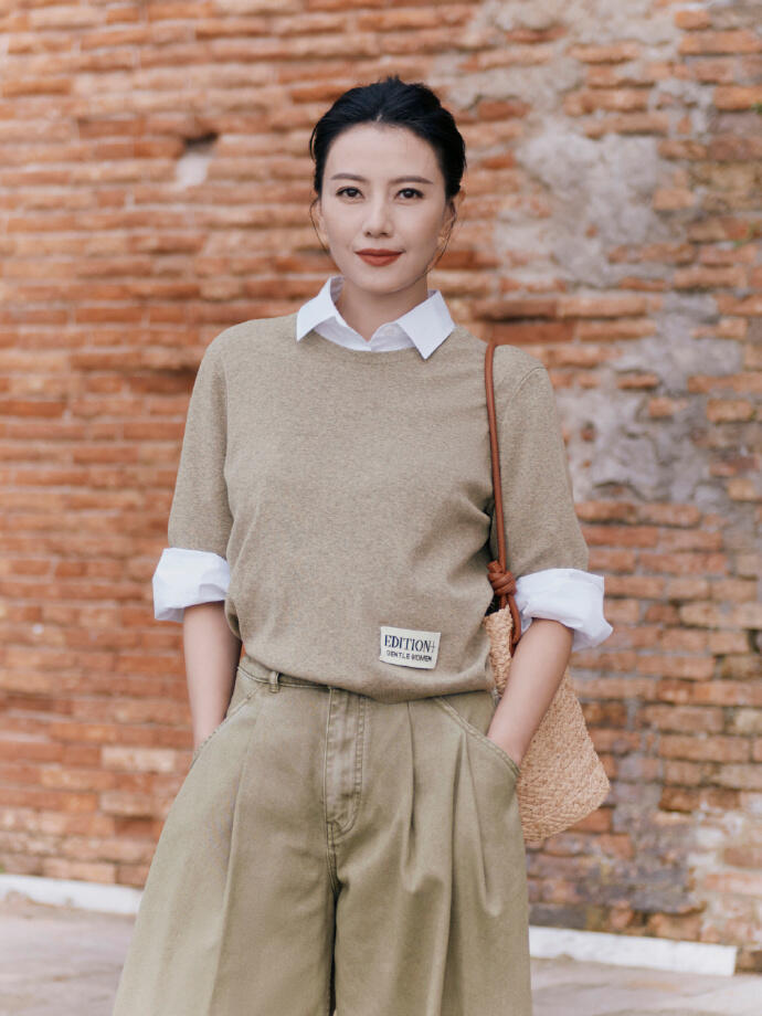 她穿了一件卡其色的圆领薄款针织衫,里面穿一件白色衬衫,把领子和袖子露出来,显得没有那么单调,也显得很时尚。搭配一条和上衣颜色一样卡其色的高腰阔腿裤,显高又有气场,而且很有高级感,非常有气质的老钱风穿搭。