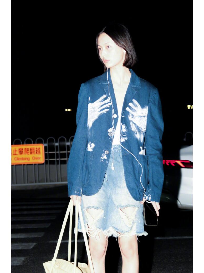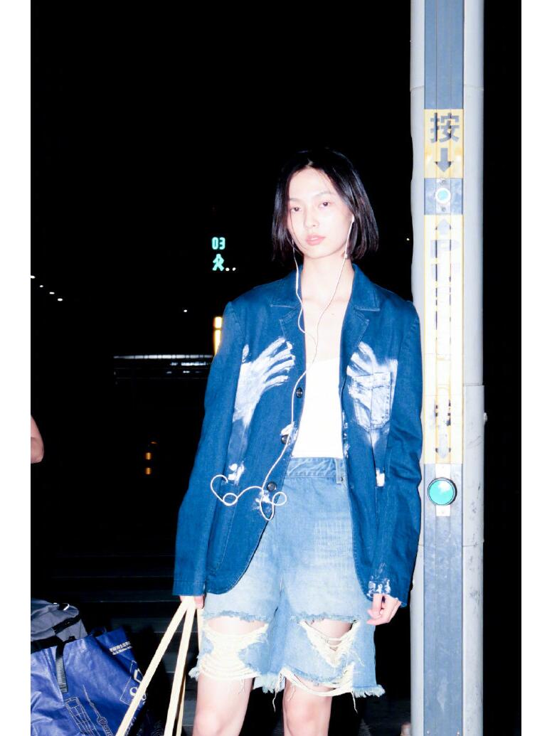 她穿了一件胸前印花的牛仔外套,V领收腰的牛仔外套,印花比较有特色,很有设计感的一件牛仔衣。这衣服来自麦昆。她内搭了一件白色的小背心,配一条浅蓝色的破洞牛仔短裤,时髦又有个性的一套穿搭。