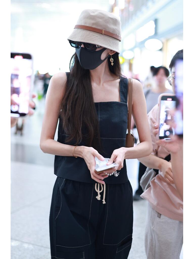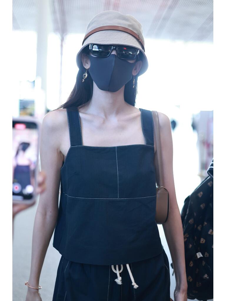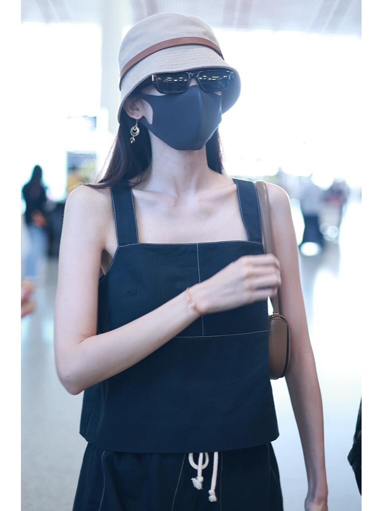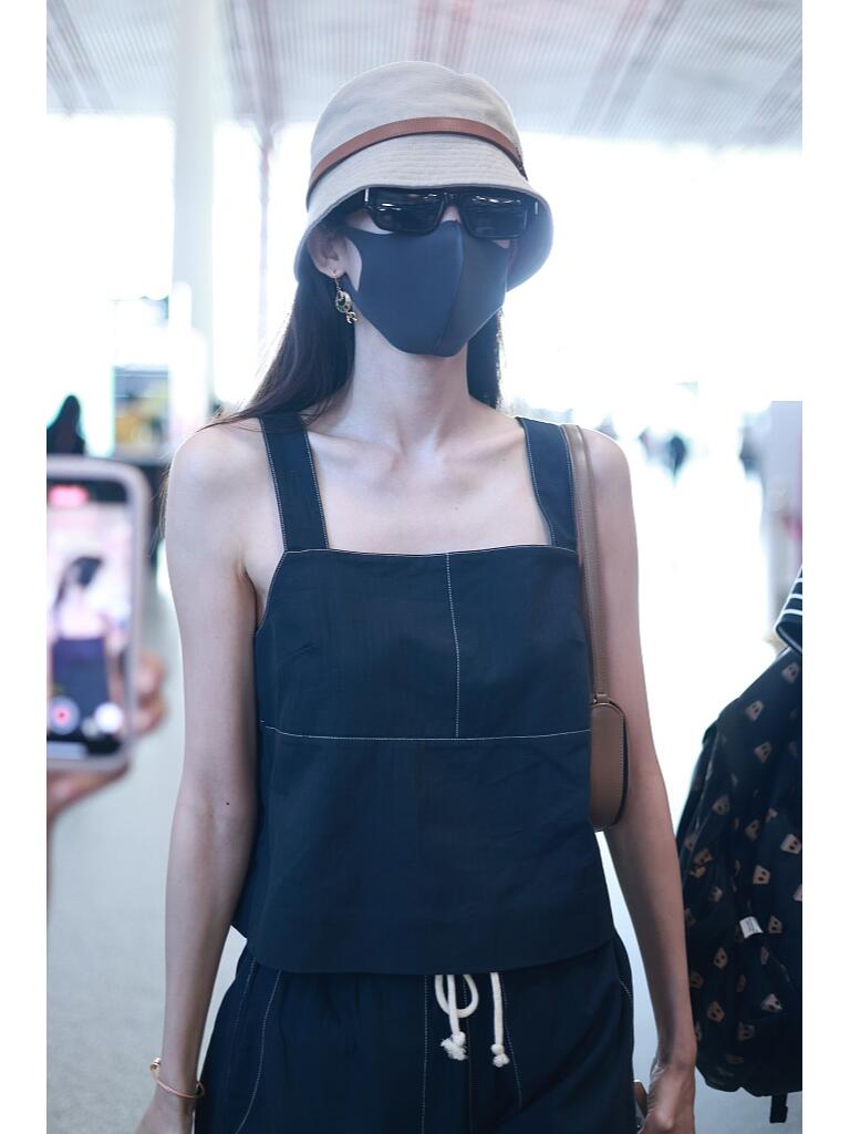 她穿了一件黑色的吊带上衣,方领宽带短款的小上衣,简单大方又清凉舒适。搭配了一条黑色的抽绳收腰的休闲裤,上短下松,又透气凉爽。帽子和鞋子选择了白色,显得没有那么暗沉。
