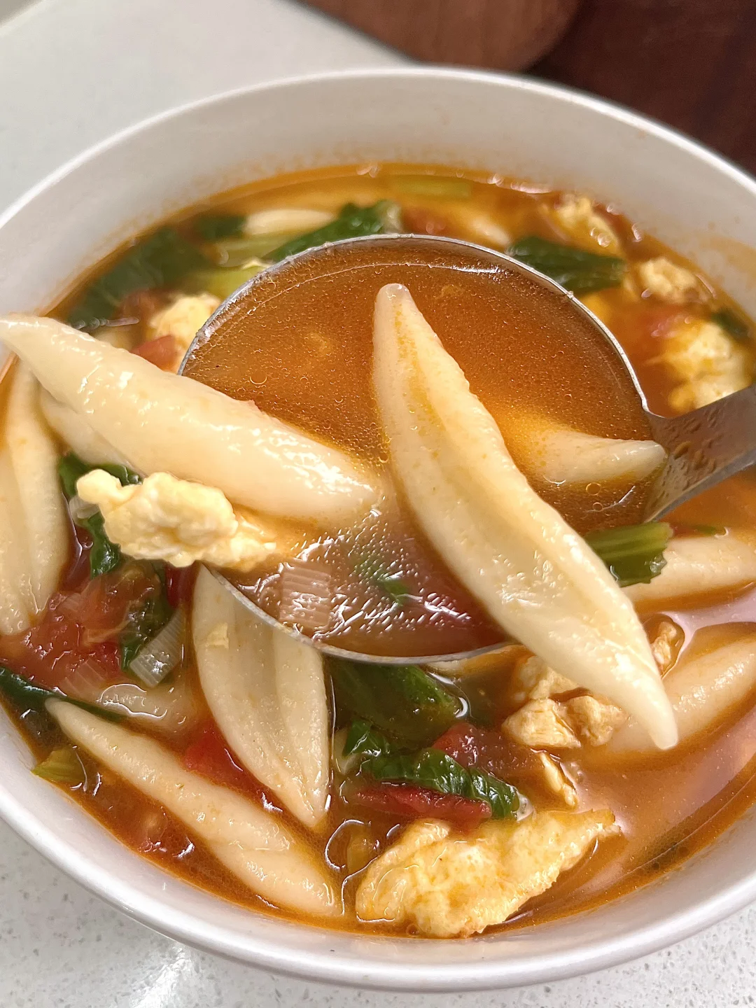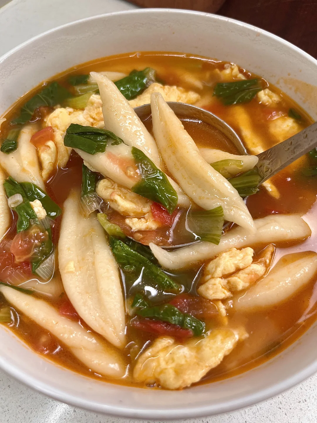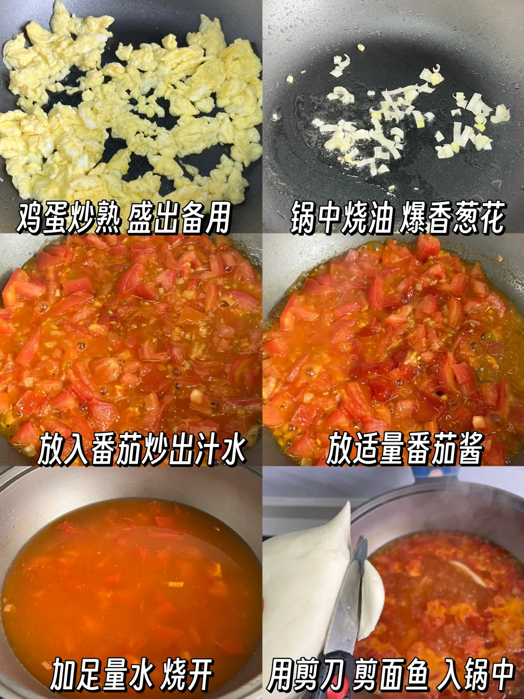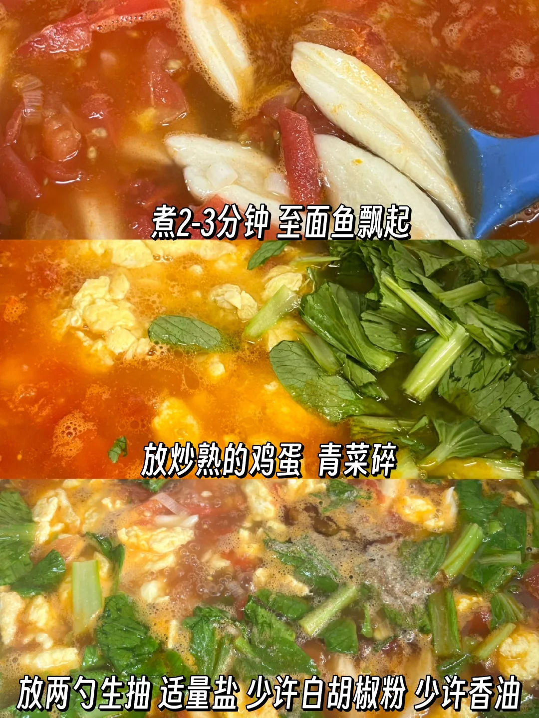 今天晚餐长这样 🌟做法: 1️⃣300g面粉中加少许盐,放约150g水,粗略揉成团,盖上保鲜膜松弛半小时,揉成光滑面团 2️⃣鸡蛋炒熟,盛出备用;锅中烧油,爆香葱花,放入番茄翻炒出汁,放入适量番茄酱 3️⃣加足量水烧开,用剪刀剪入面鱼,煮2-3分钟,至面鱼飘起 4️⃣放入熟鸡蛋碎、青菜碎,放两勺生抽、适量盐、少许白胡椒粉、少许香油✅ -
