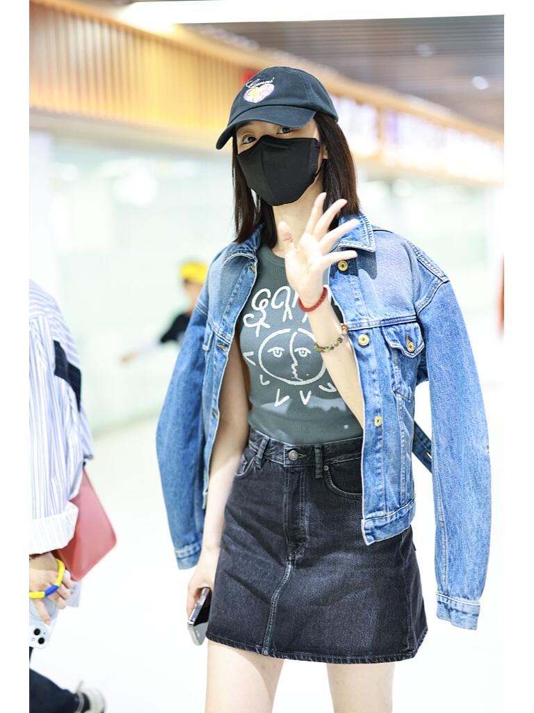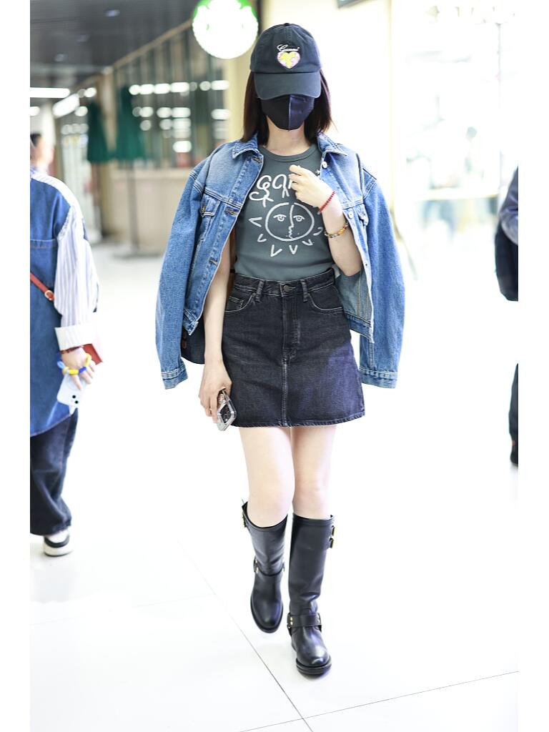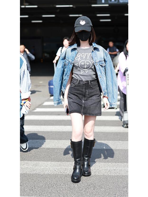 一顶深蓝色的棒球帽,披一件中蓝色的牛仔外套,内搭灰色字母印花T恤,搭配深蓝色牛仔短裙,脚踩黑色的短靴。休闲时尚又利落。很有活力的一套初夏穿搭。