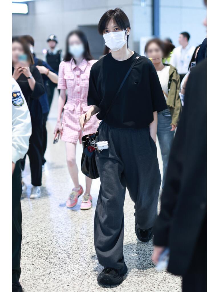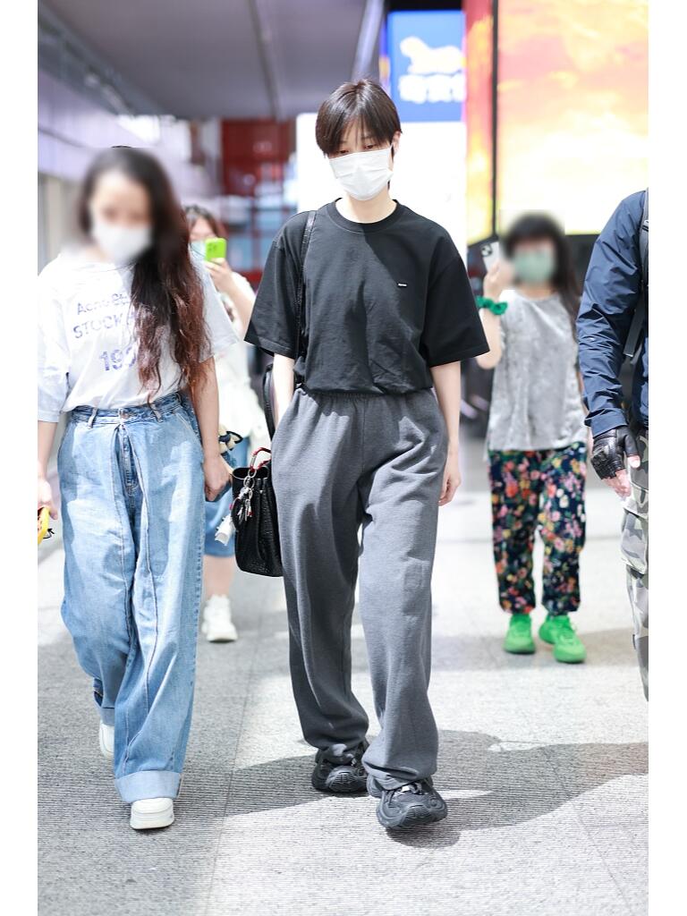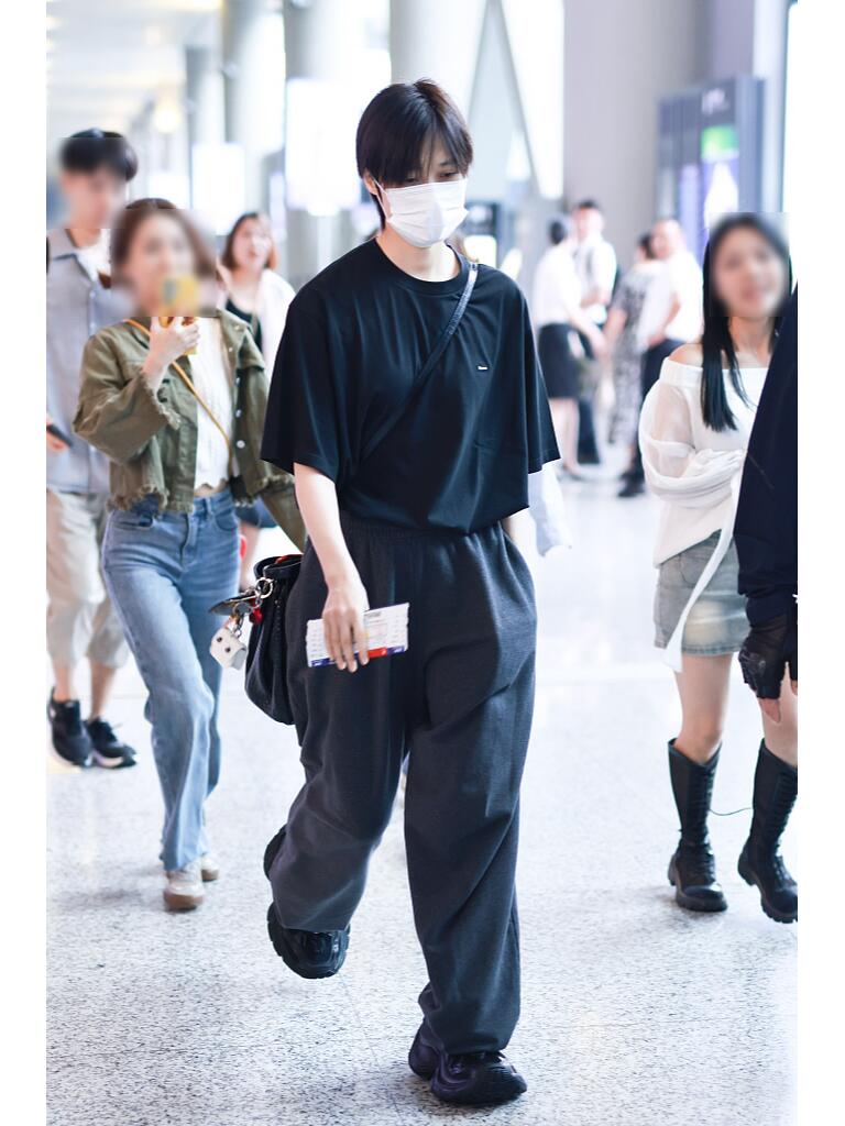 她穿的很简单,一件黑色的圆领短袖T恤,搭配一条深灰色的直筒长裤,脚上穿双黑色的鞋子,简单大方又利落显高。很休闲的一套搭配。