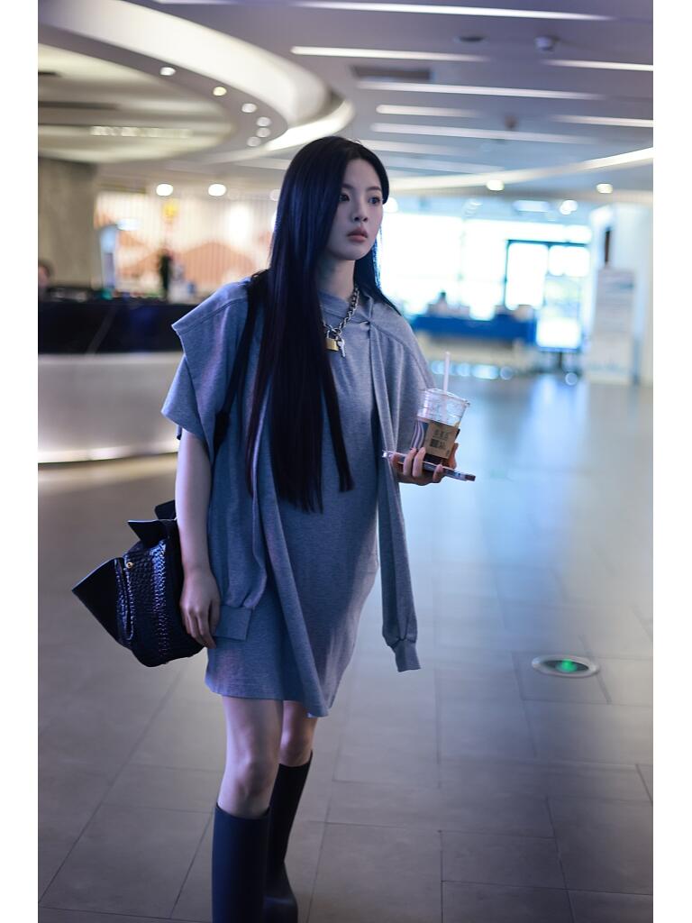 她穿了一件灰色的T恤裙,把一件灰色的长袖卫衣披在肩上,时尚又有层次感。脖子上的链条锁头项链不错,又潮又特别。
