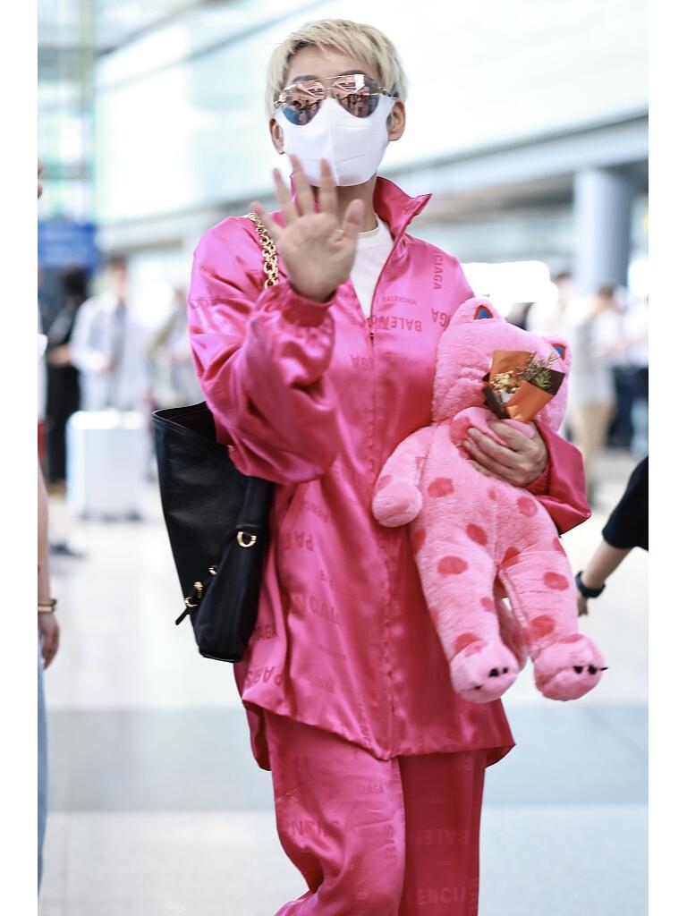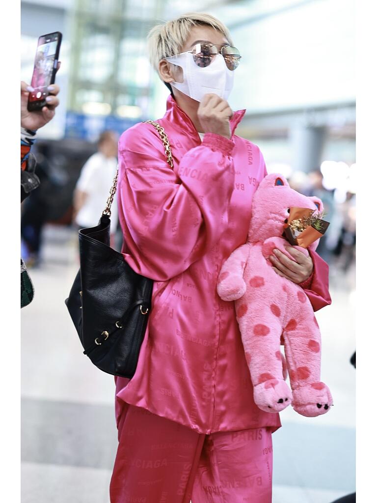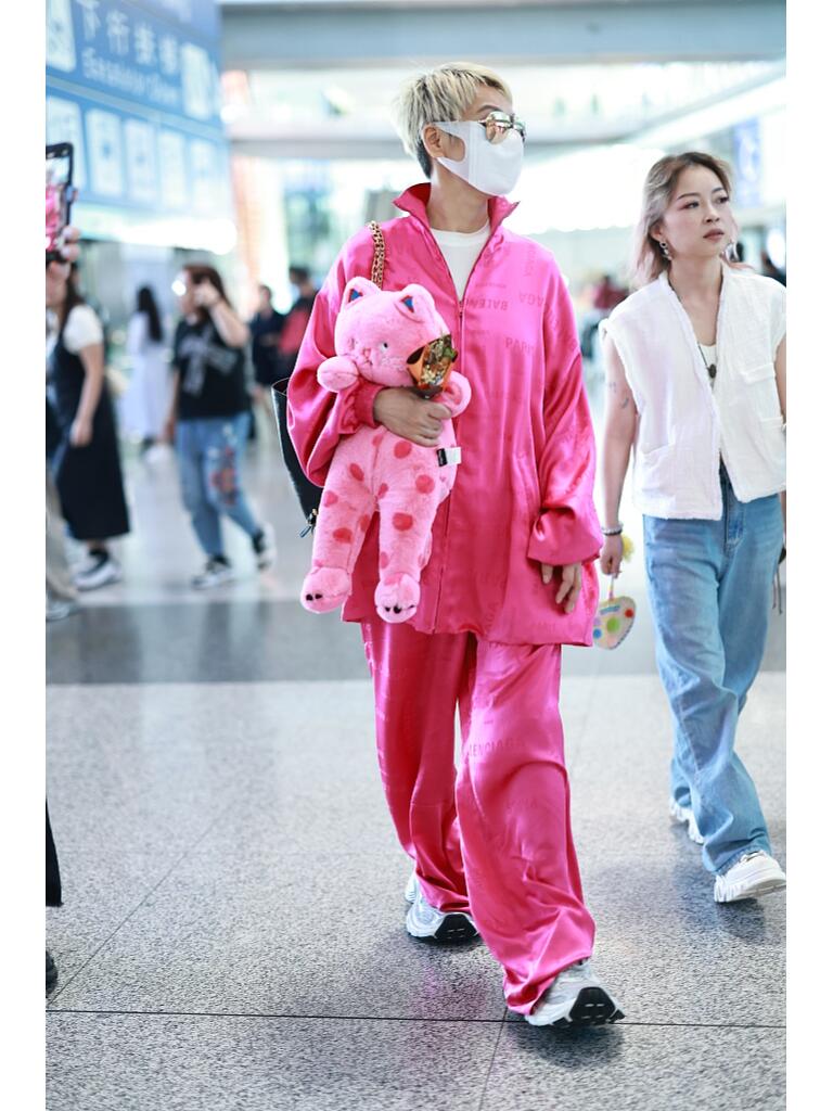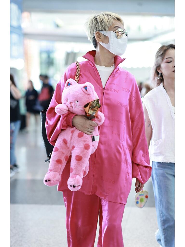 白金发配玫红套装,好醒目 她这个样子好酷呀。一头金发,加上墨镜,穿一身玫红色的运动风套宽松套装,抱粉红色波点熊。舒适又张扬。这回头率特别高。