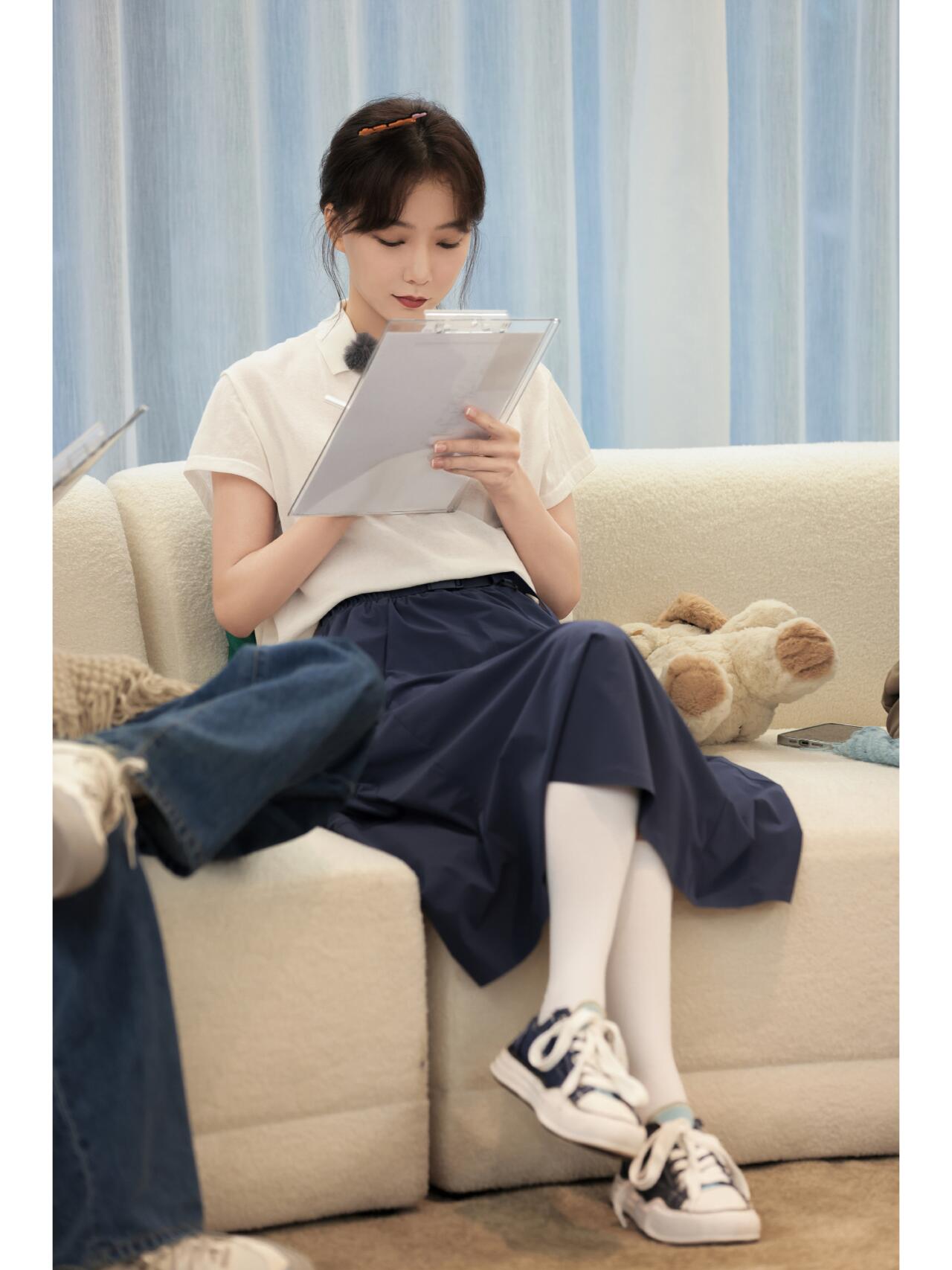 她戴了一顶米色的草帽,穿一件米白色的POLO领短袖T恤,搭配深蓝色的半身裙。休闲时尚又简约大方。