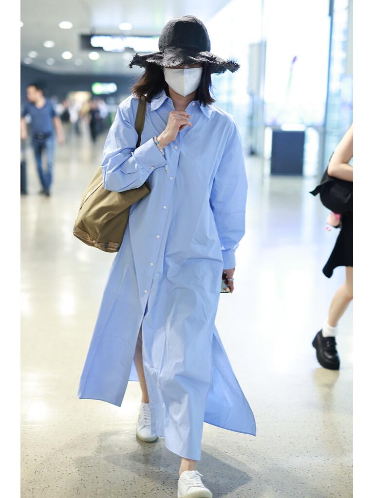 她戴了一顶黑色的渔夫帽,穿了一件浅蓝色的衬衫连衣裙,搭配小白鞋。简单清新,还有些随性自在的感觉。很潮的初夏穿搭。不过这衬衫连衣裙有点太长了,只有个子高的人穿才能撑起来。小个子要穿短一点的。