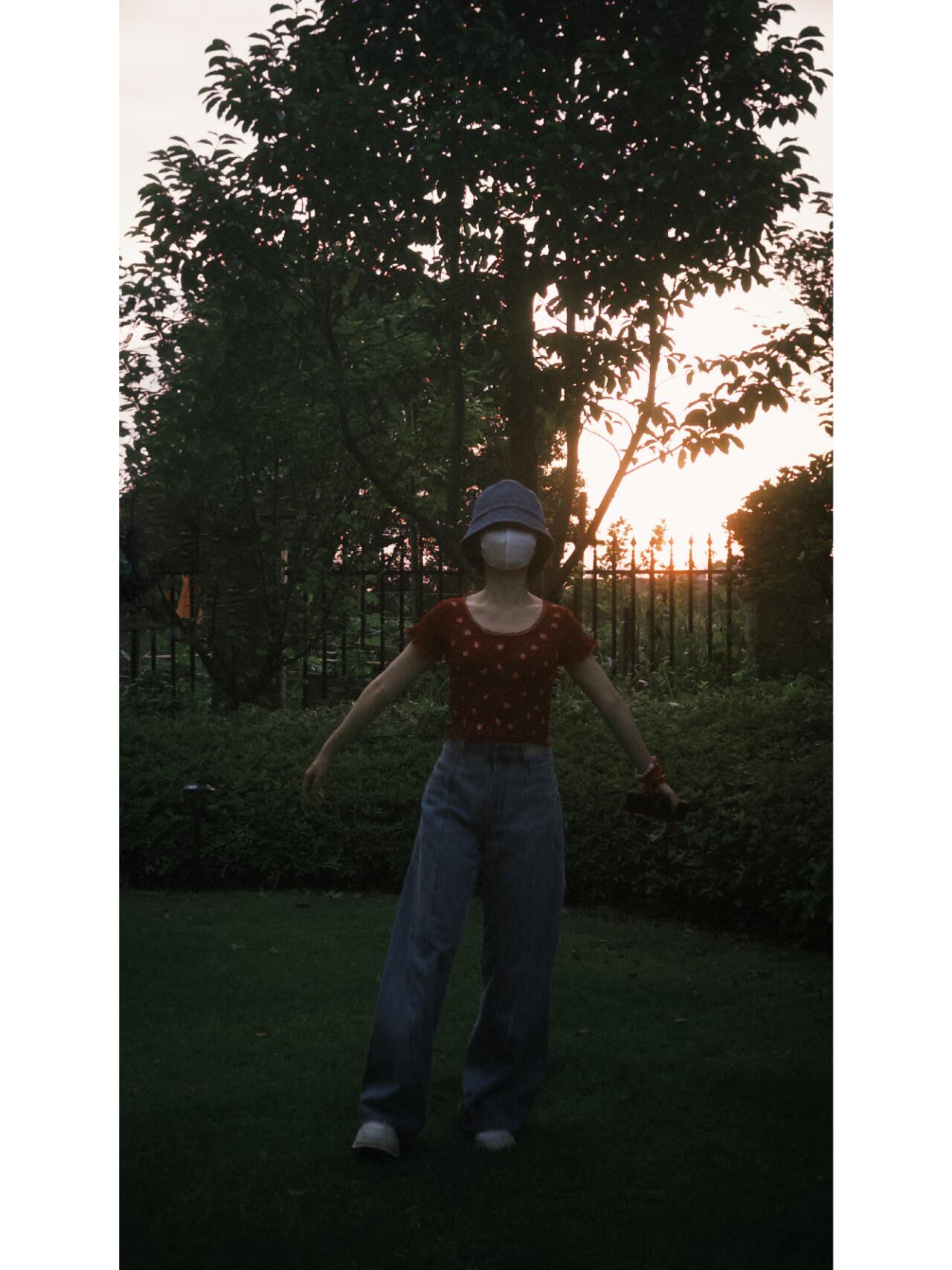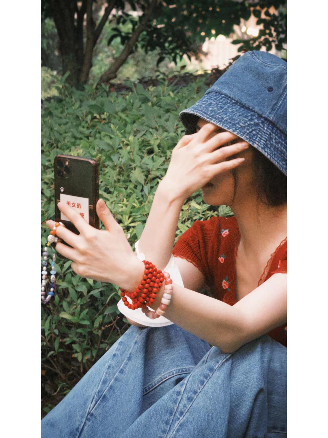 她戴了一顶牛仔蓝色的渔夫帽,穿一件红色大圆领印花的短袖T恤,这T恤是件相对修身的小T恤,穿起来显高又利落。搭配牛仔阔腿裤很顺眼的。上短下松,显高时尚。