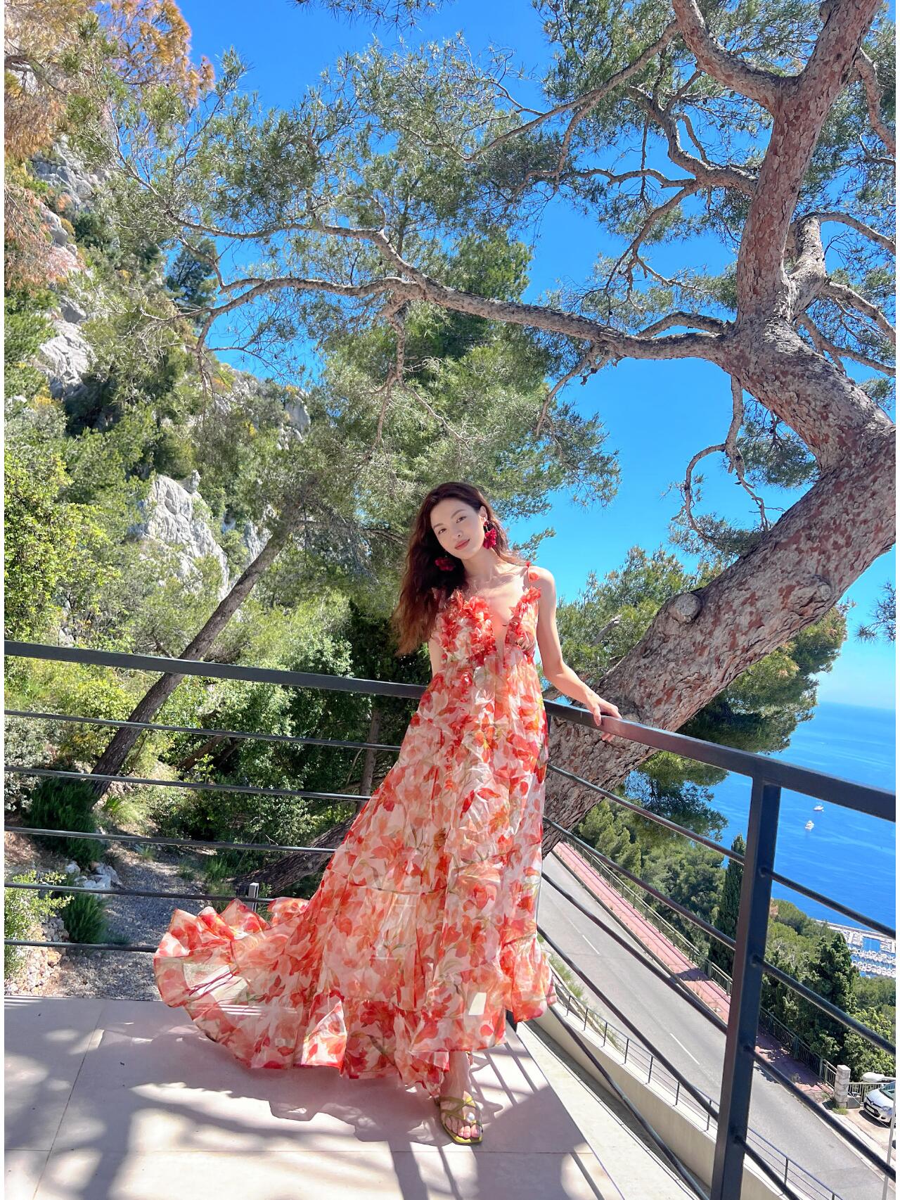 这花裙子穿的很有气质 钟楚曦这气质真不错,她这衣品也超级好。她穿了一条粉红色花朵的吊带礼服长裙,这裙子的裙摆还是多层的,有点荷叶边的感觉。