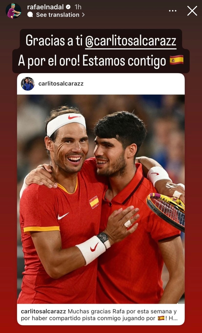 奥运会男双八强战落败出局之后,阿尔卡拉斯在社媒发文向纳达尔表达了感谢:“拉法,非常感谢这一周能和我一起搭档为西班牙队出战双打,今天虽然没能赢球,但我还是为未来收获了很多,非常特殊的一段经历❤️”