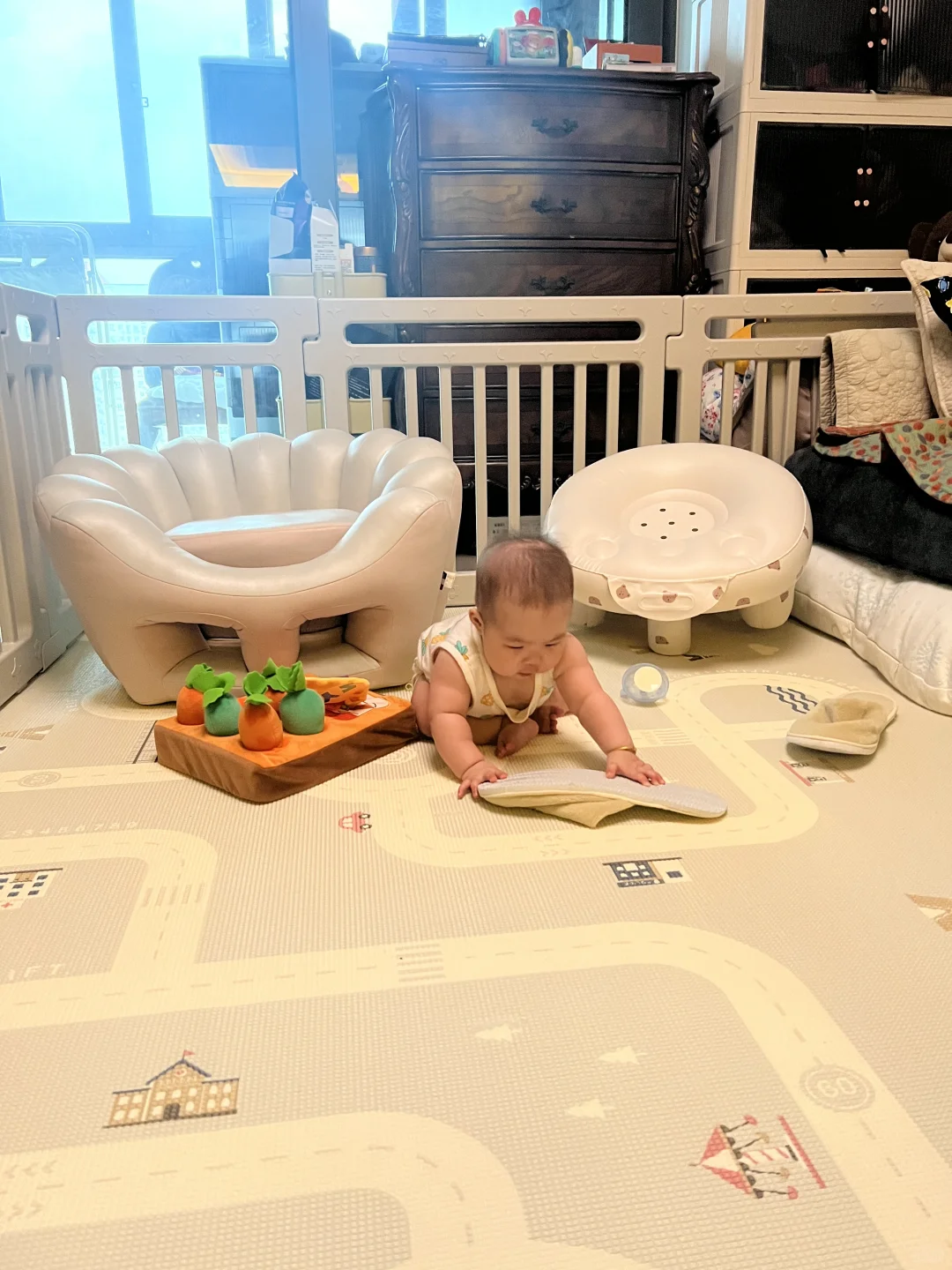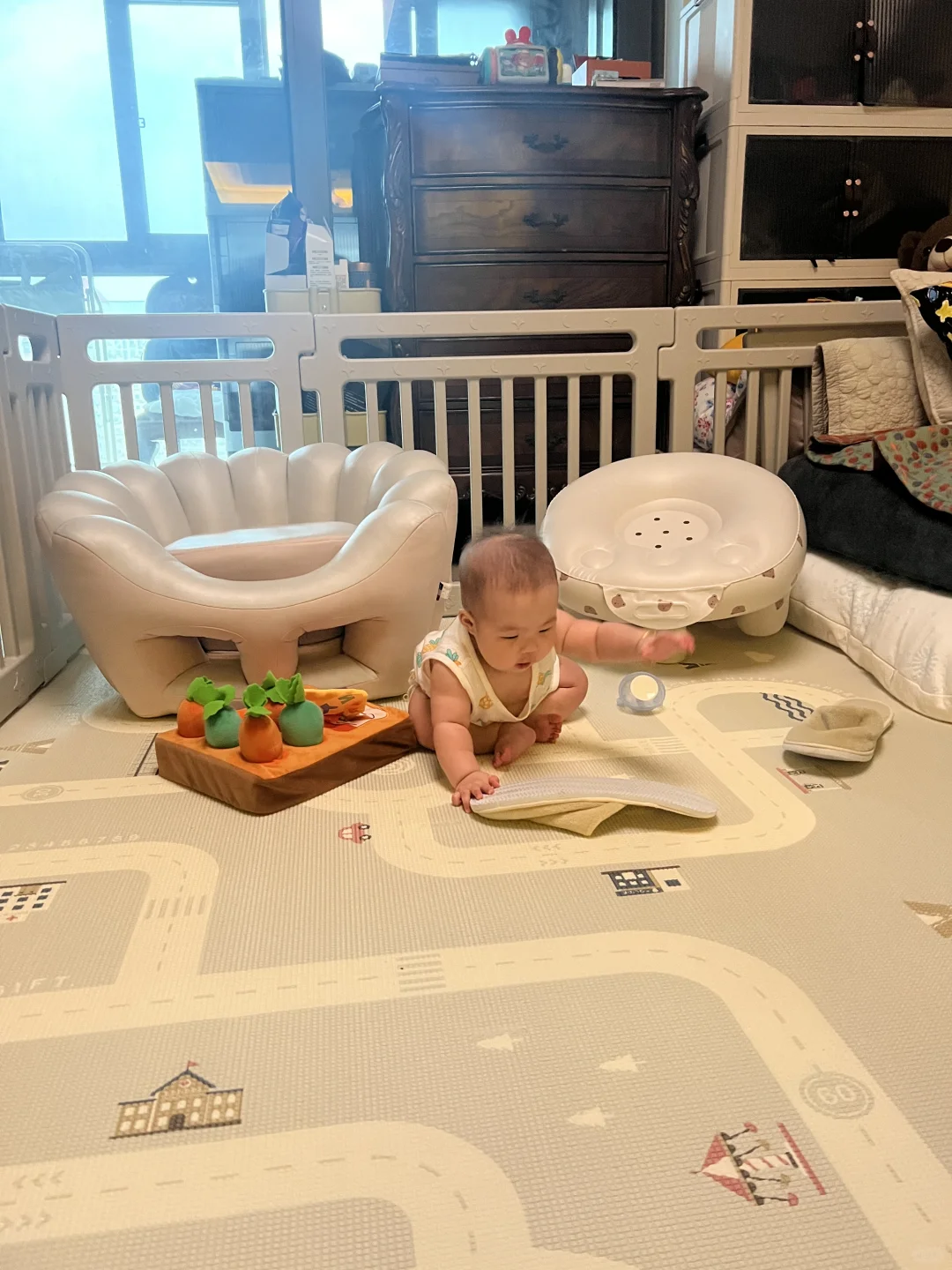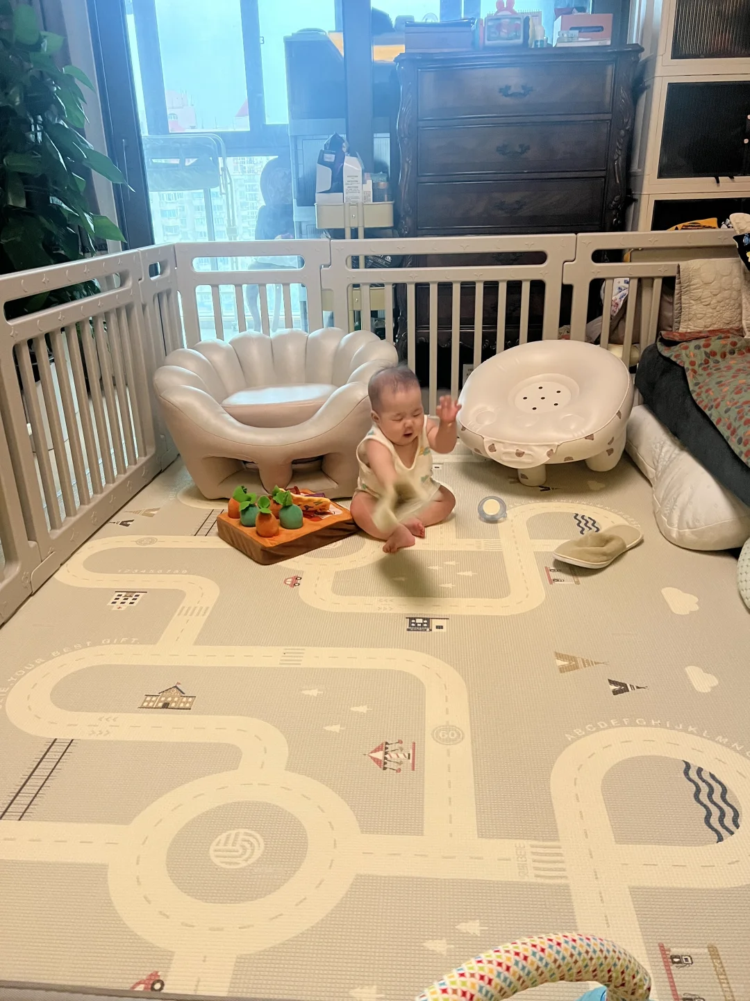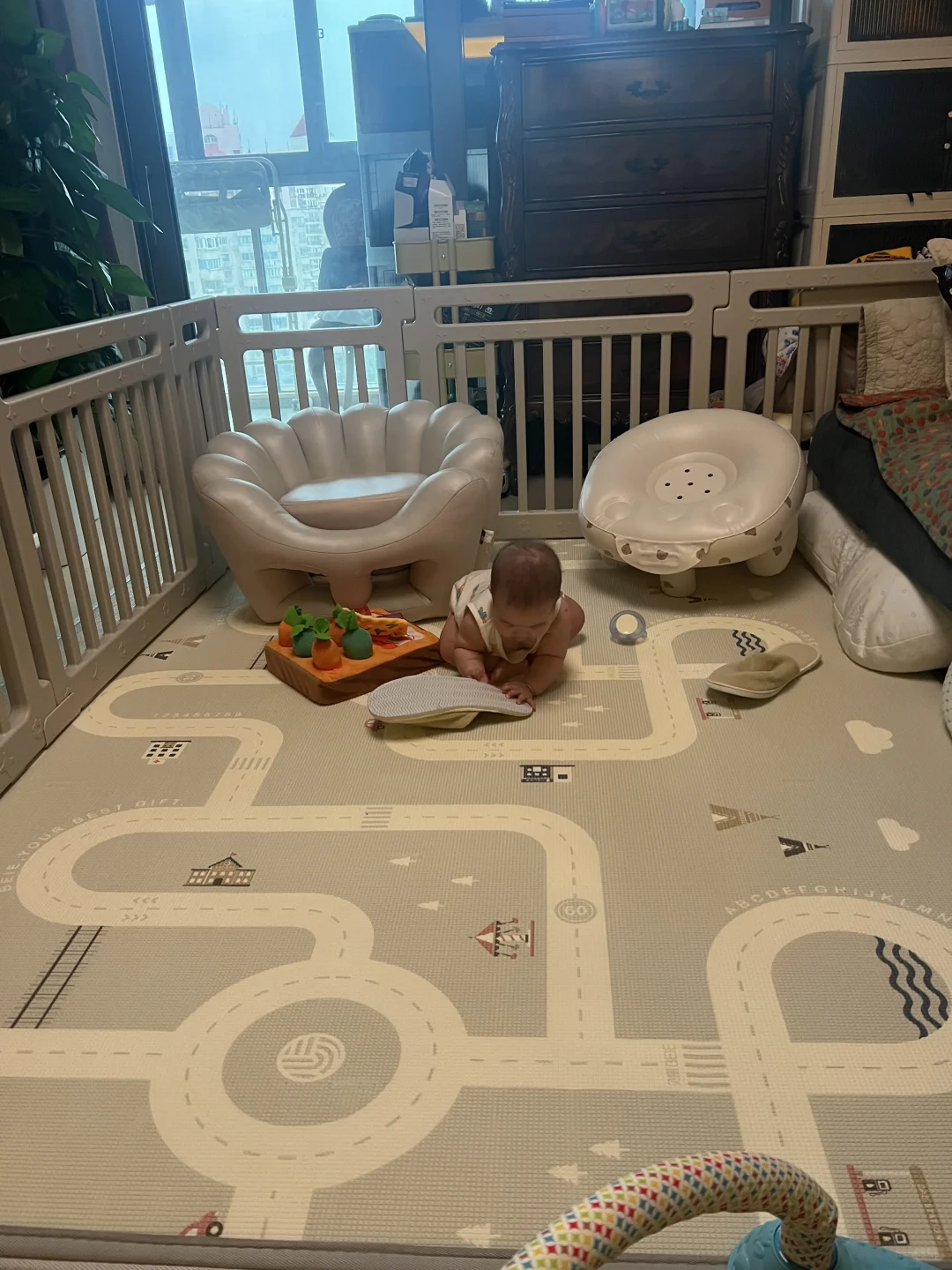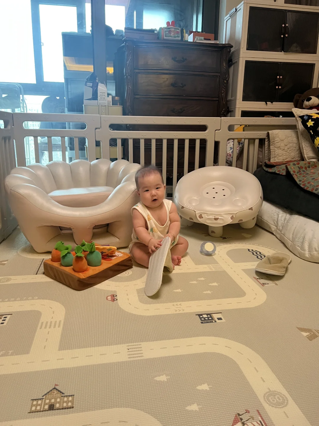 可不~我们刚会匍匐前进了,本来不爱动,我脱那的拖鞋,飞快挪过去要抓