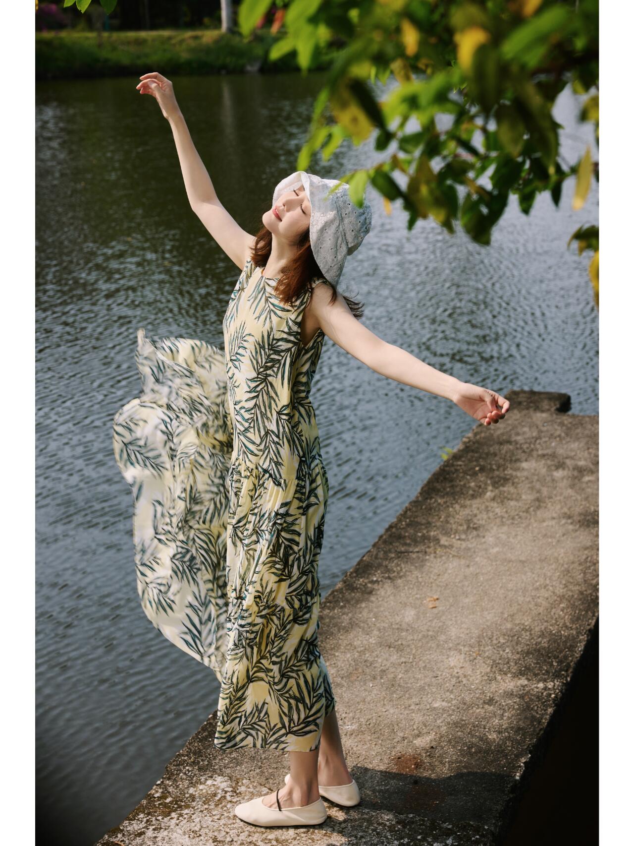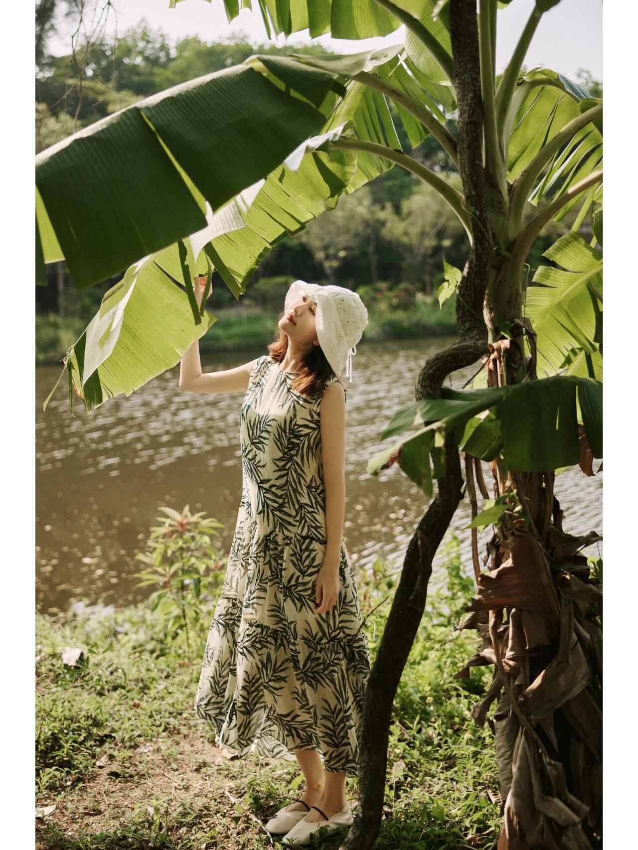 她穿了一件杏色底色加黑色印花的无袖长款连衣裙,戴白色的针织凉帽,浪漫复古,很有度假风情。这套很适合去海边玩的时候穿。