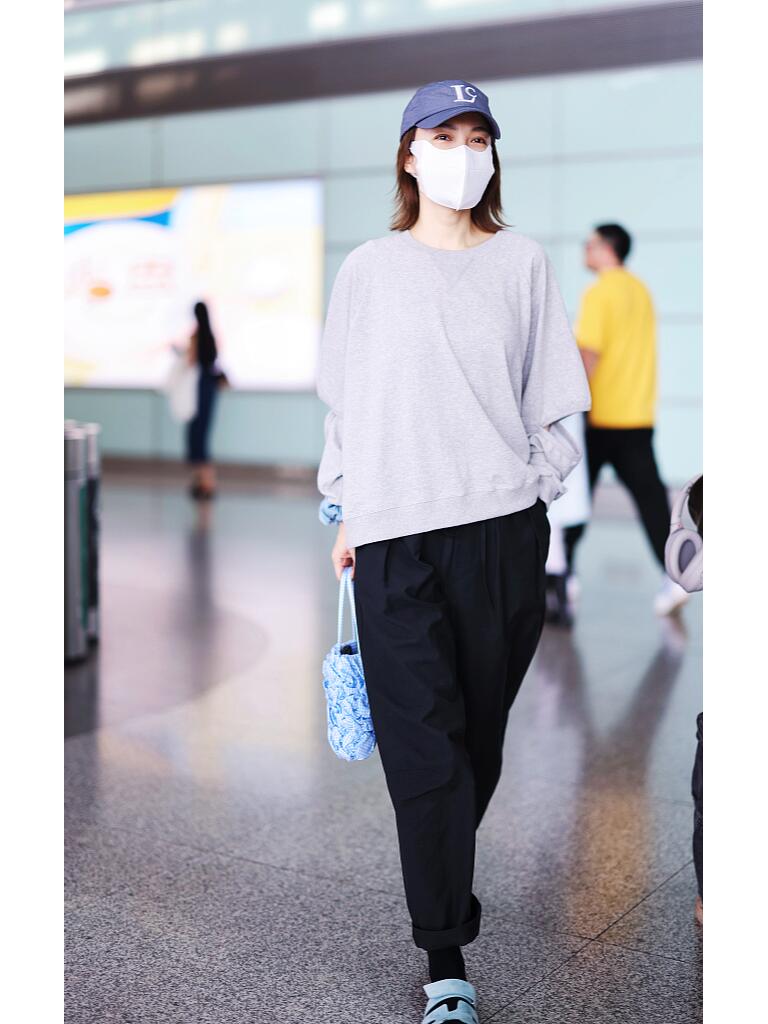 她穿了一件浅灰色的长袖T恤,这T恤的袖子还是个挖洞的,时髦透气又个性。她搭配了一条黑色的休闲裤,简单有型又舒适自在。