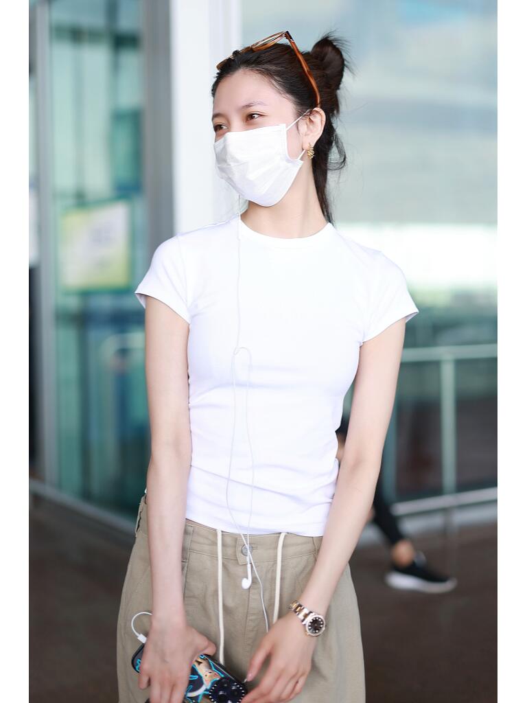她穿了一件白色的短袖T恤,这T恤特点很明星,小圆领的修身短袖T恤,比较贵气,也很利落。但是这T恤还是比较挑人,脖子短和上身胖的人都不适合穿。比较勒脖子,也很显胖。