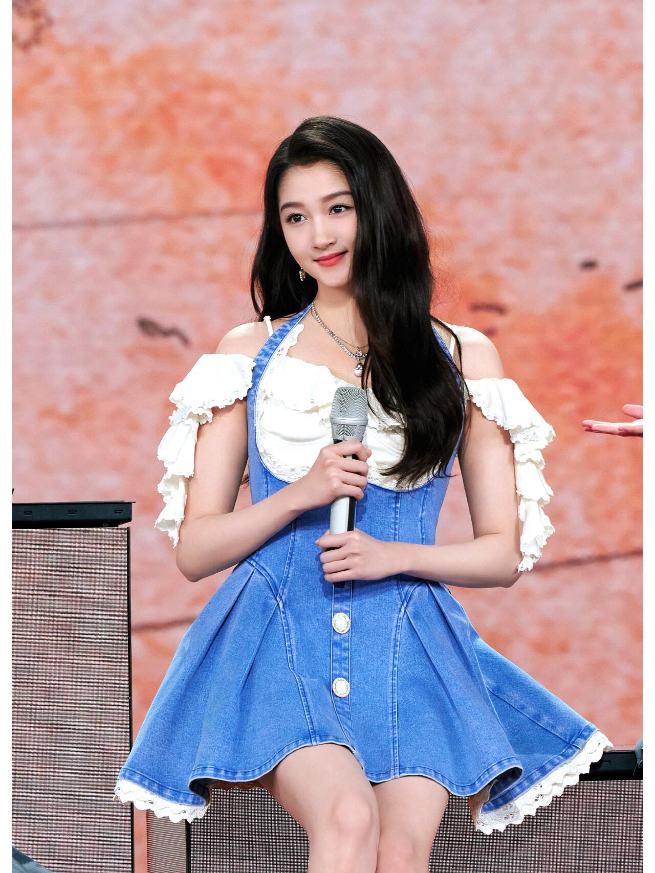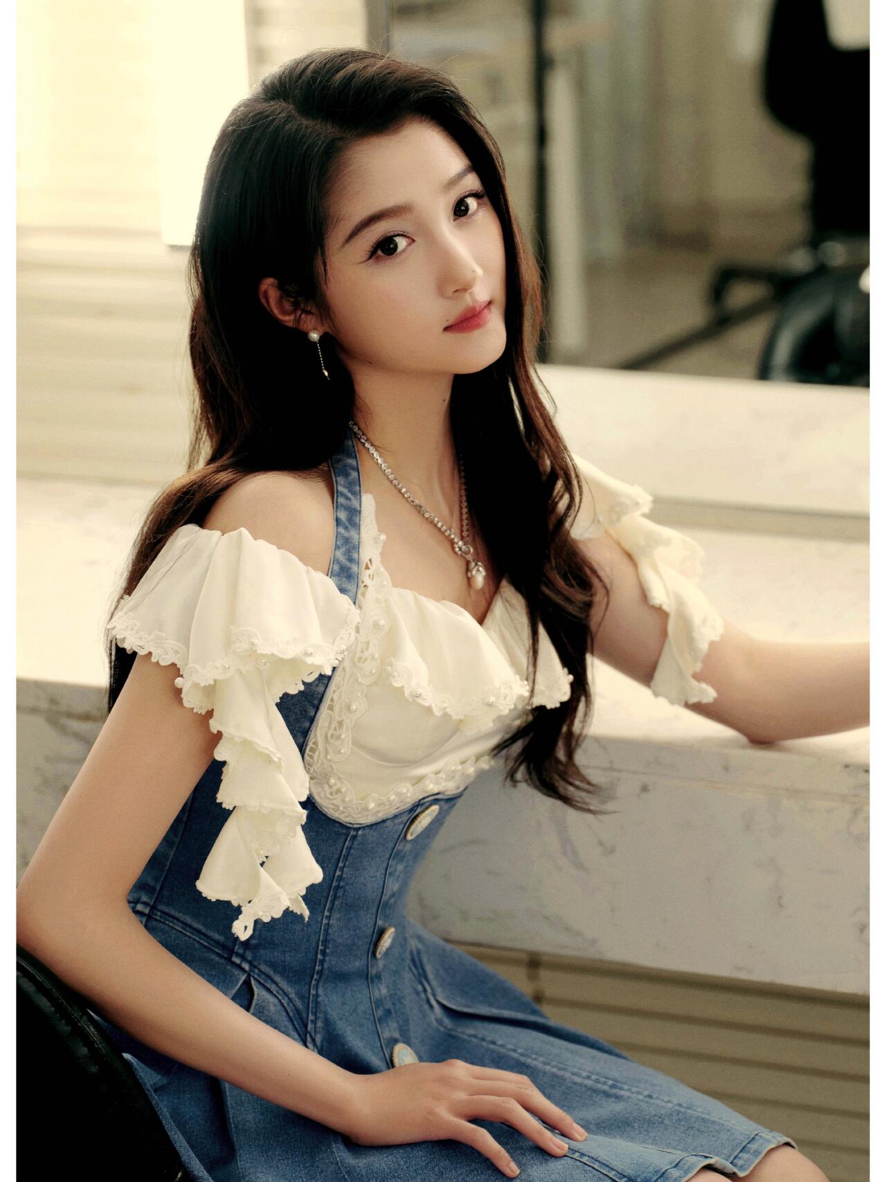 她穿了一件白色的露肩花边抹胸上衣,搭配一条牛仔挂脖细带牛仔裙,这裙子的下擂还有白色花边装饰,很短的小伞裙,甜美又浪漫,很有青春感。