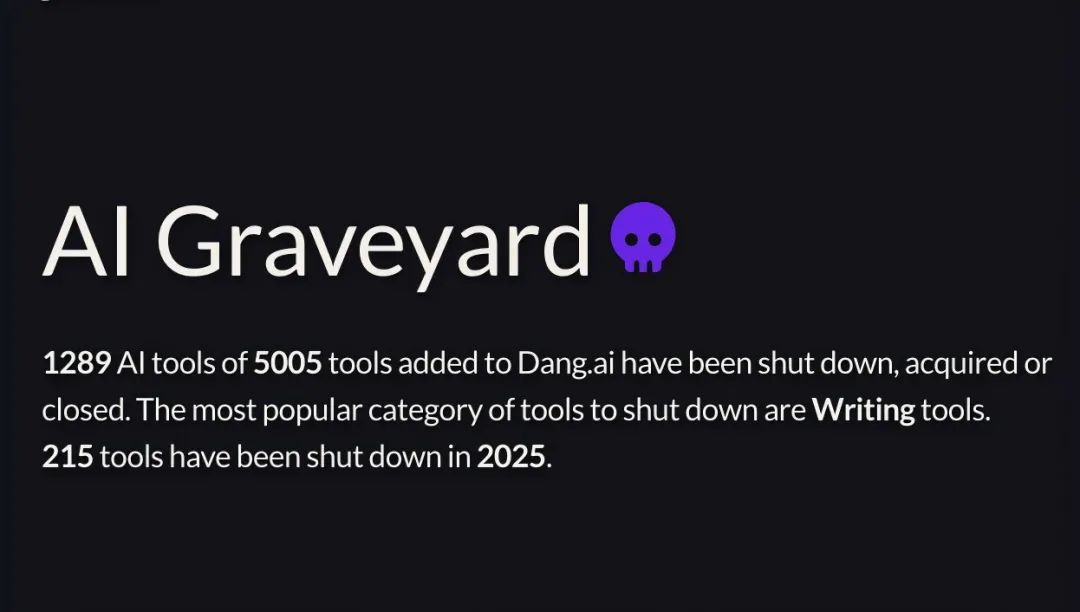 但他没说的是,每一个领域涌现出新的当红辣子鸡,每一轮融资和用户注意力争夺背后,有一大批的AI创业项目正在「消失」。根据AI工具聚合网站「DANG!」创建的AI Graveyard(AI墓地)数据,截至目前,在其收录超5000个AI项目中,有1289个已被关闭、被收购或关闭。