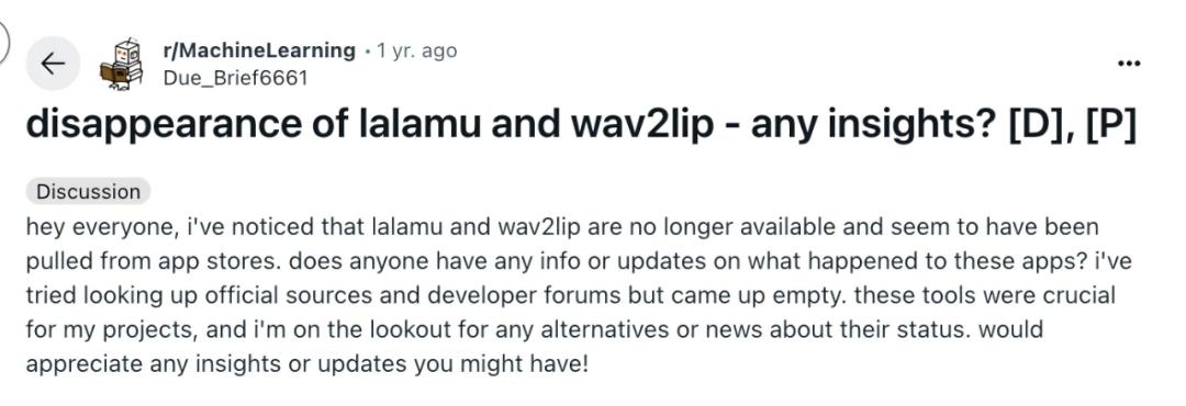 一年前,Reddit上,有开发者曾发布这样的帖子:“我注意到lalamu和wav2lip已经下架了,请问有人知道这些应用发生了什么吗?我尝试查找官方资源和开发者论坛,但都一无所获,这些工具对我的项目至关重要......”。