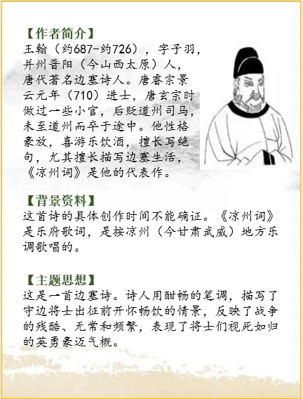 王翰(约687-约726),字子羽,并州晋阳(今山西太原)人,唐代著名边塞诗人。唐睿宗景云元年(710)进士,唐玄宗时做过一些小官,后贬道州司马,未至道州而卒于途中。他性格豪放,喜游乐饮酒,擅长写绝句,尤其擅长描写边塞生活,《凉州词》是他的代表作。