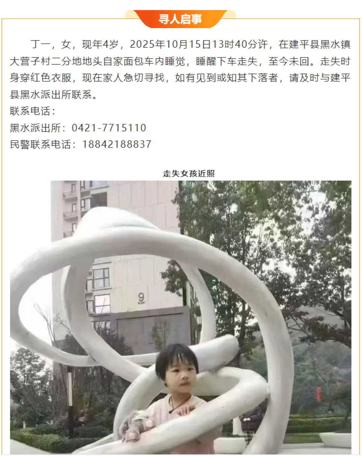10月16日,辽宁省朝阳市建平县公安局发布寻人启事称,2025年10月15日13时40分许,4岁女童丁一在建平县黑水镇大营子村二分地地头自家面包车内睡觉,后走失,走失时身穿红色衣服。16日上午,大河报《看见》记者联系到女童姑姑丁女士,对方称,孩子爷爷奶奶带着她上山秋收,将孩子放在地头的面包车里睡觉,大概二十分钟后,孩子奶奶发现女童不见踪影。