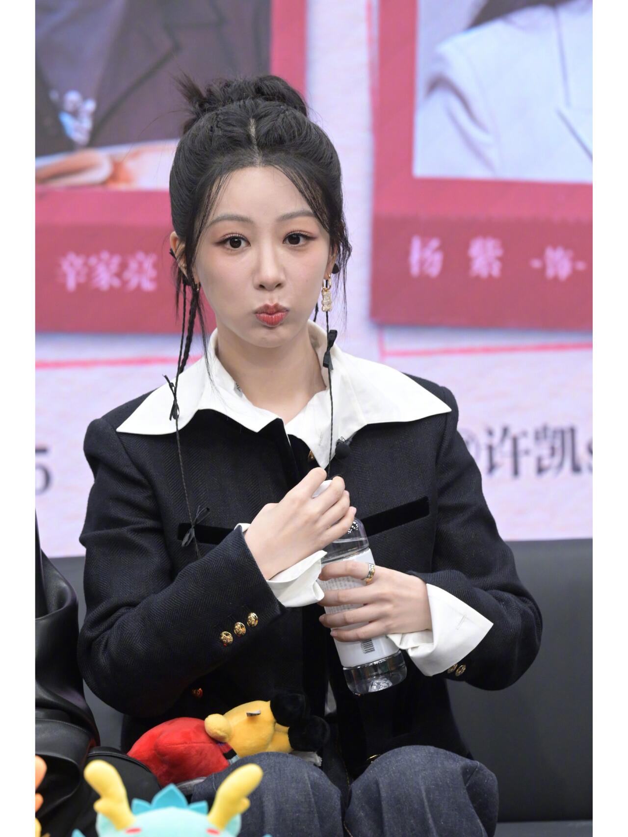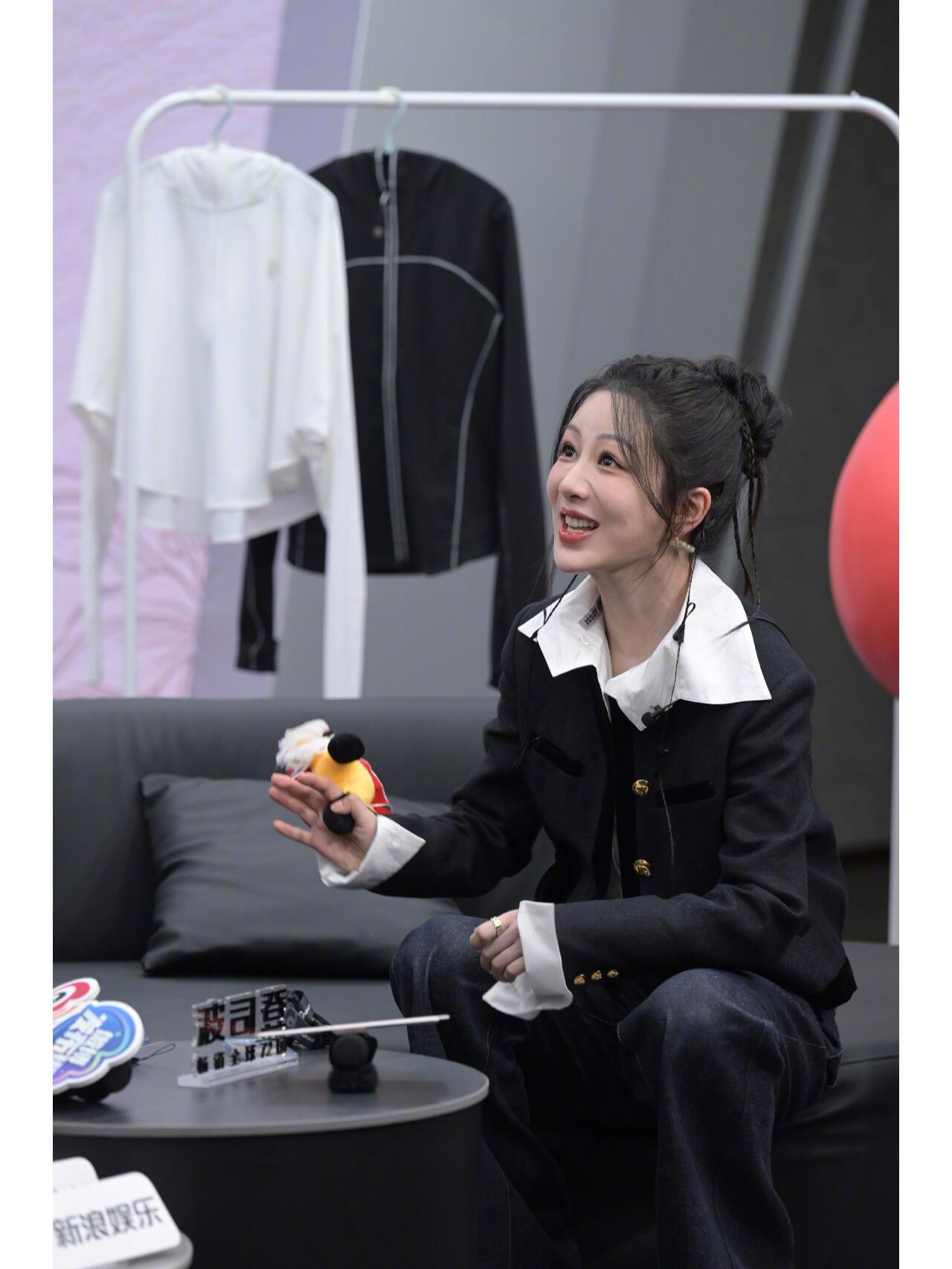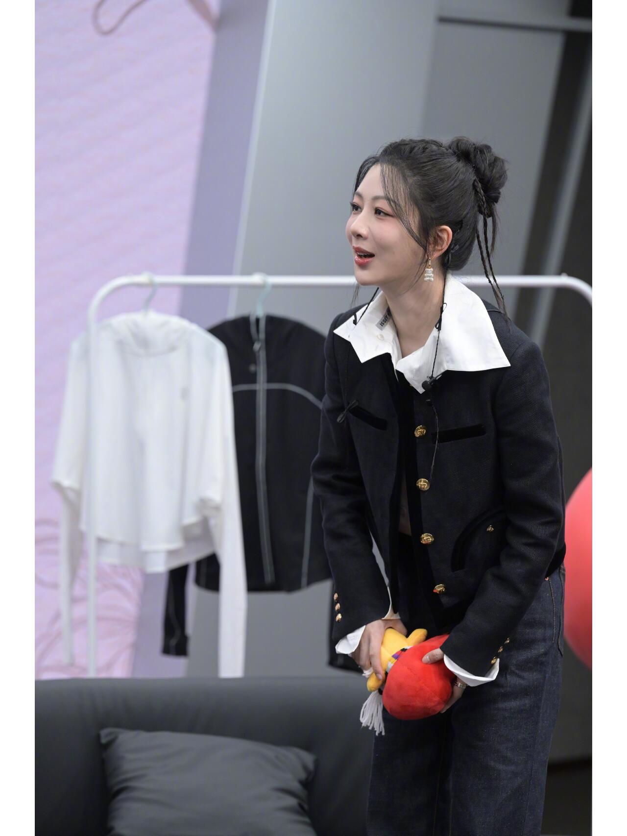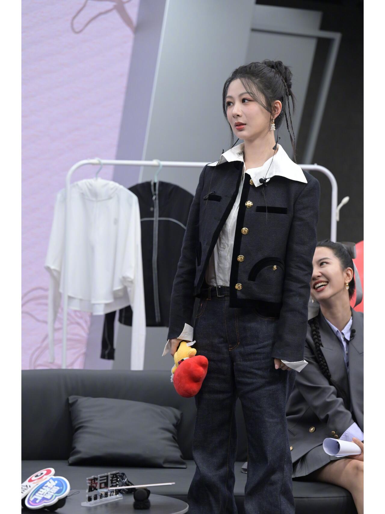她穿了一件黑色的短外套,内搭白色翻领衬衫,配黑色直筒裤,简单复古,比较简单,也很有特色的一套春日穿搭。