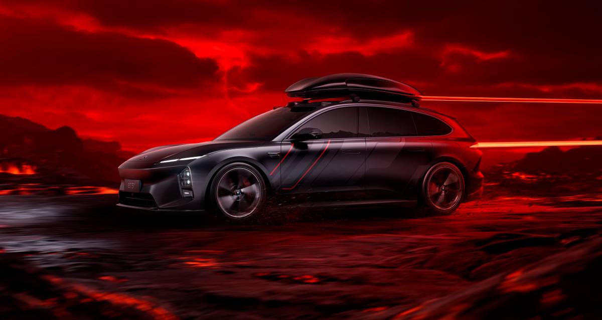 外观打造上,蔚来ET5T暗影套装延续了普通版车型的整体设计,搭载ADB智能多光束大灯与Double-Dash日间行车灯,前舱盖通过筋线设计强化肌肉感。新车车身以黑色为底色,搭配红/灰色拉花与车顶行李箱,可选装碳纤维轮毂盖,整体造型兼具旅行车的实用性与跑车的运动气质。尺寸方面,新车定位中型旅行车,车身长度为4790mm,轴距2888mm,后备厢容积为529-1687L。