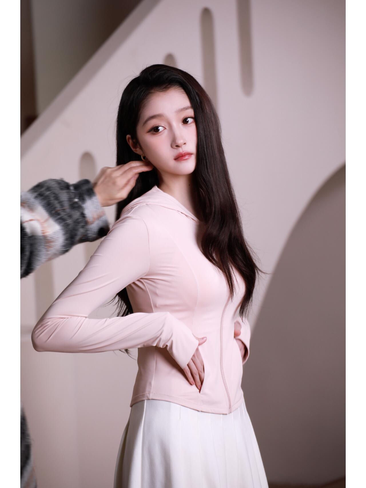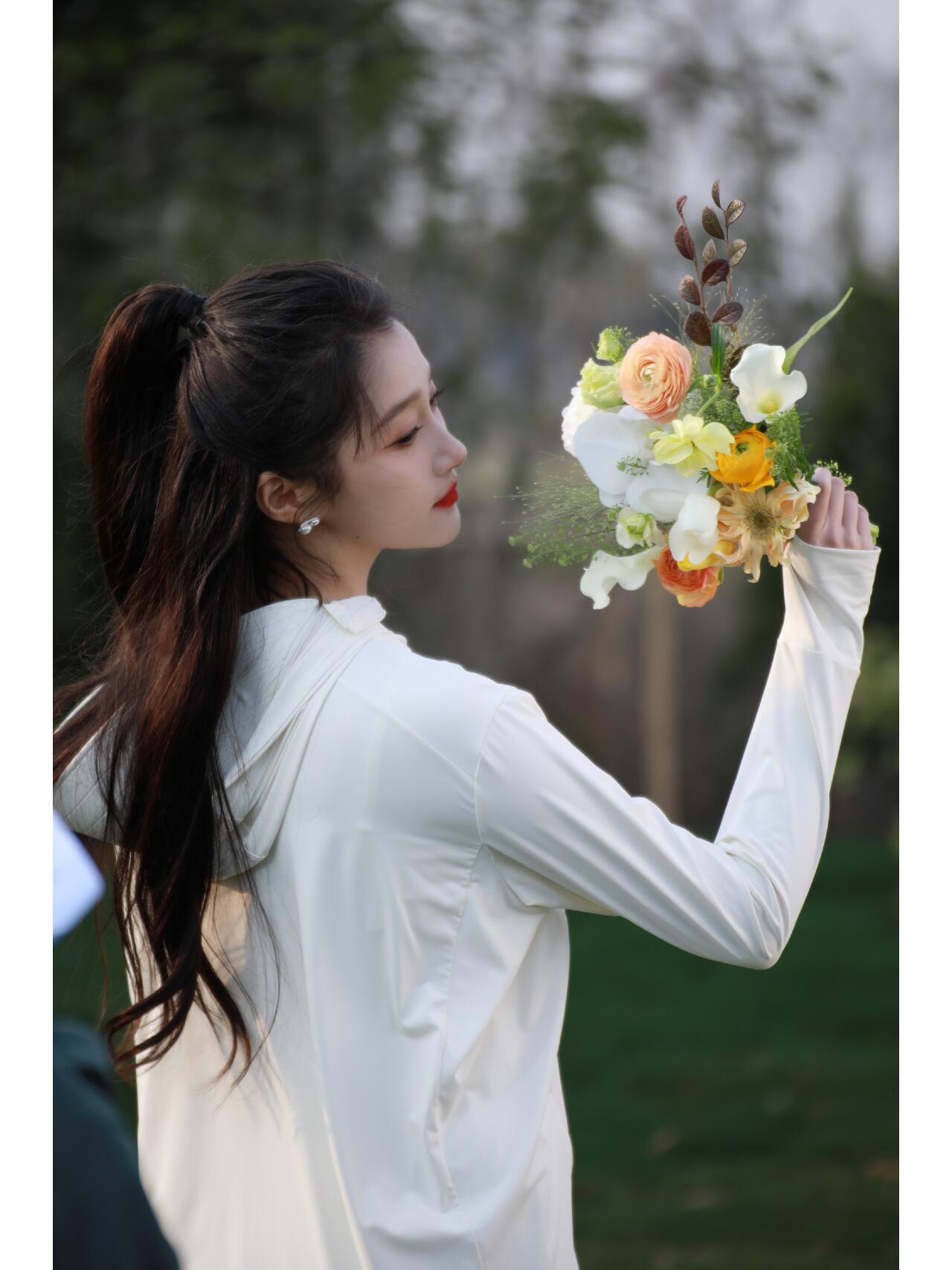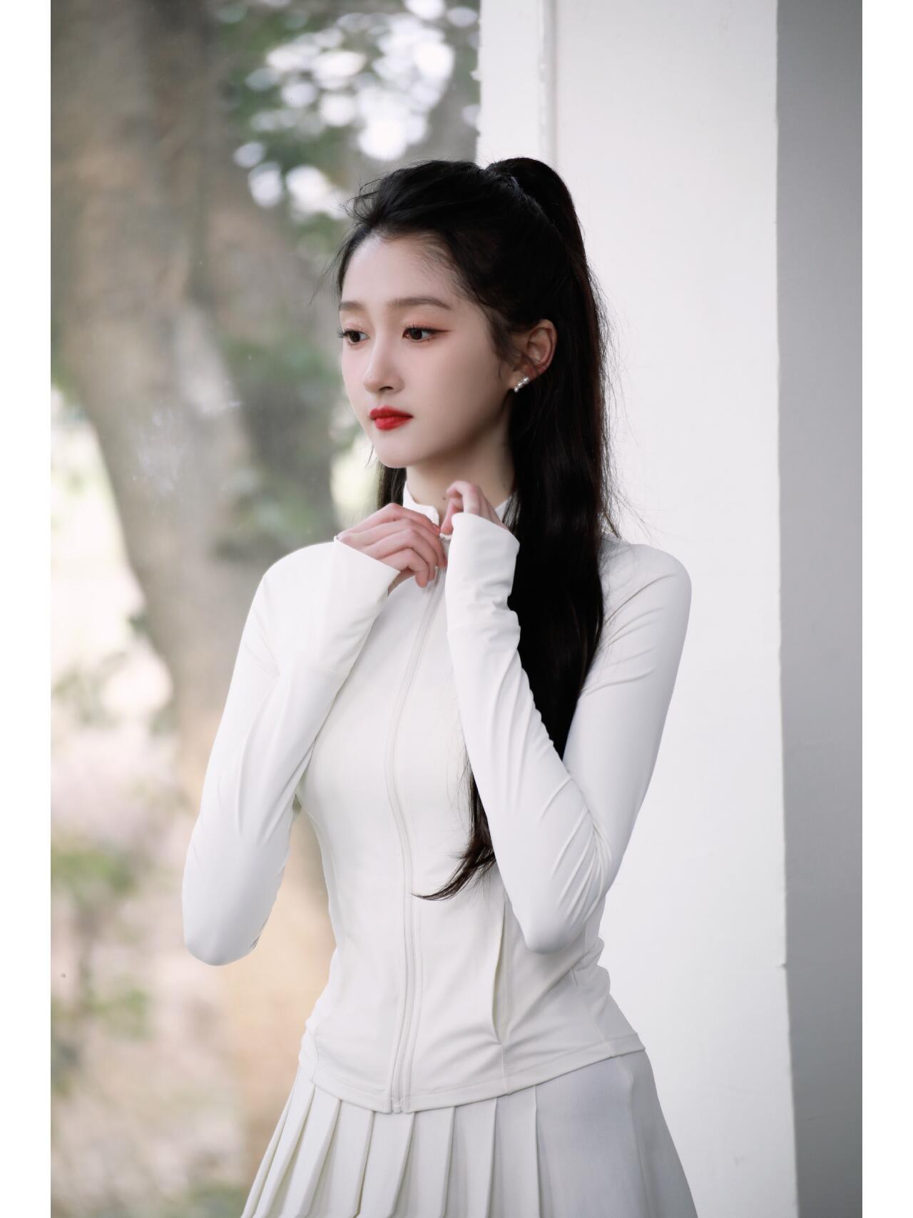 她穿了一件白色修身连帽上衣,搭配一条白色半身裙.扎个高高的怪尾,利落又有精神气.很好看的春季穿搭.