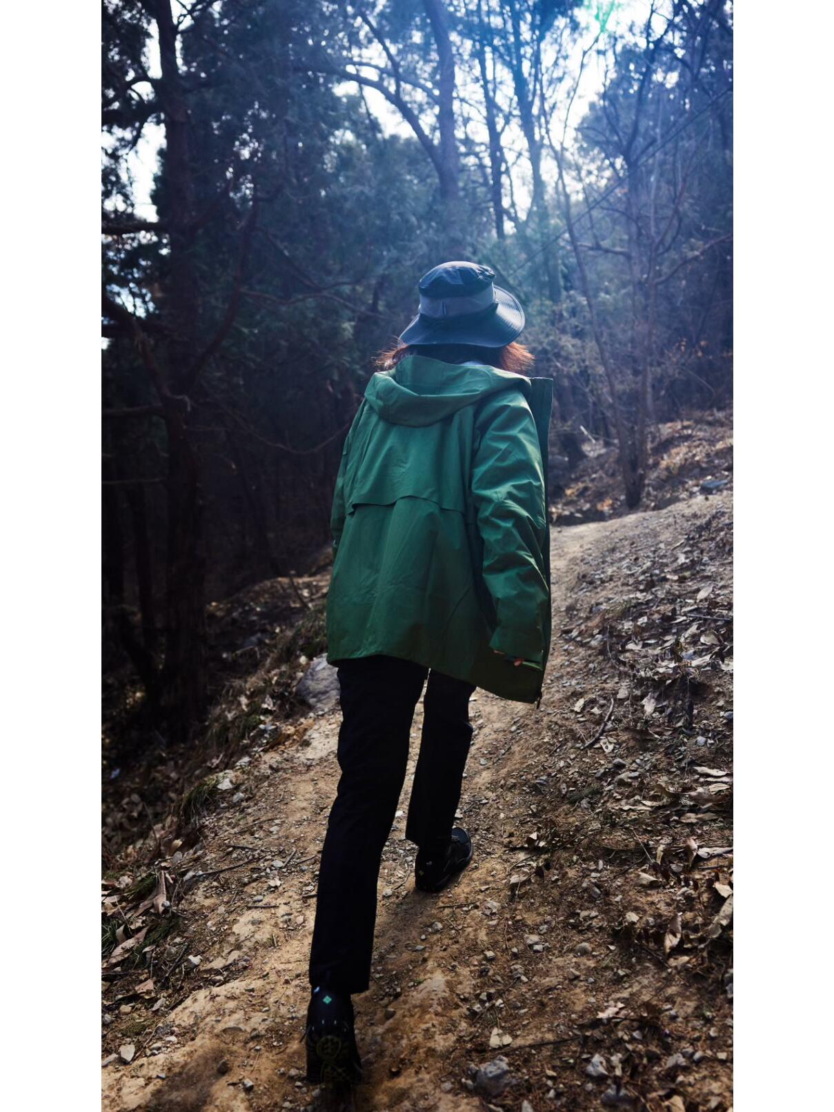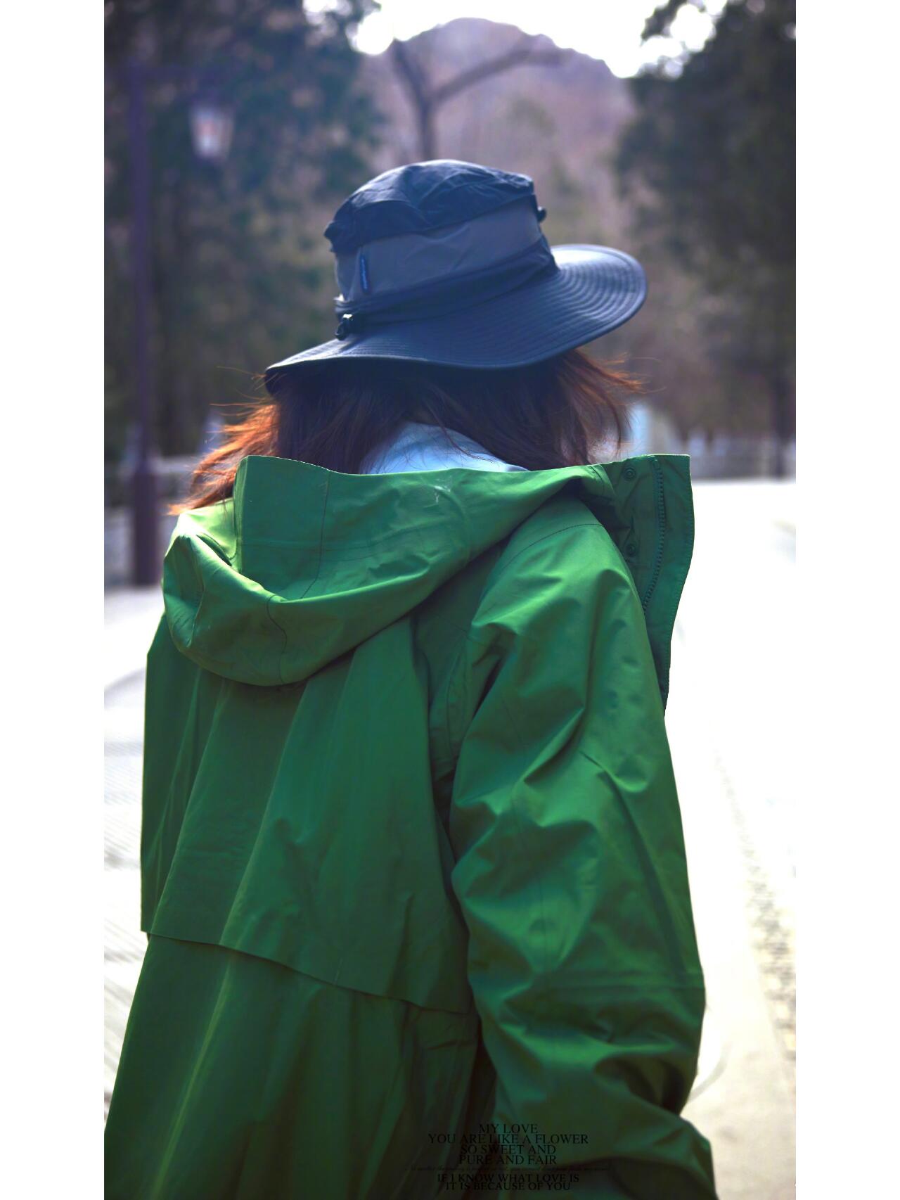 她戴了一顶蓝色的渔夫帽,穿了一件绿色的连帽冲锋衣,搭配一条黑色的直筒裤,脚上穿双黑色的运动鞋.清爽时尚又休闲舒适。很养眼的一套春季街头穿搭.