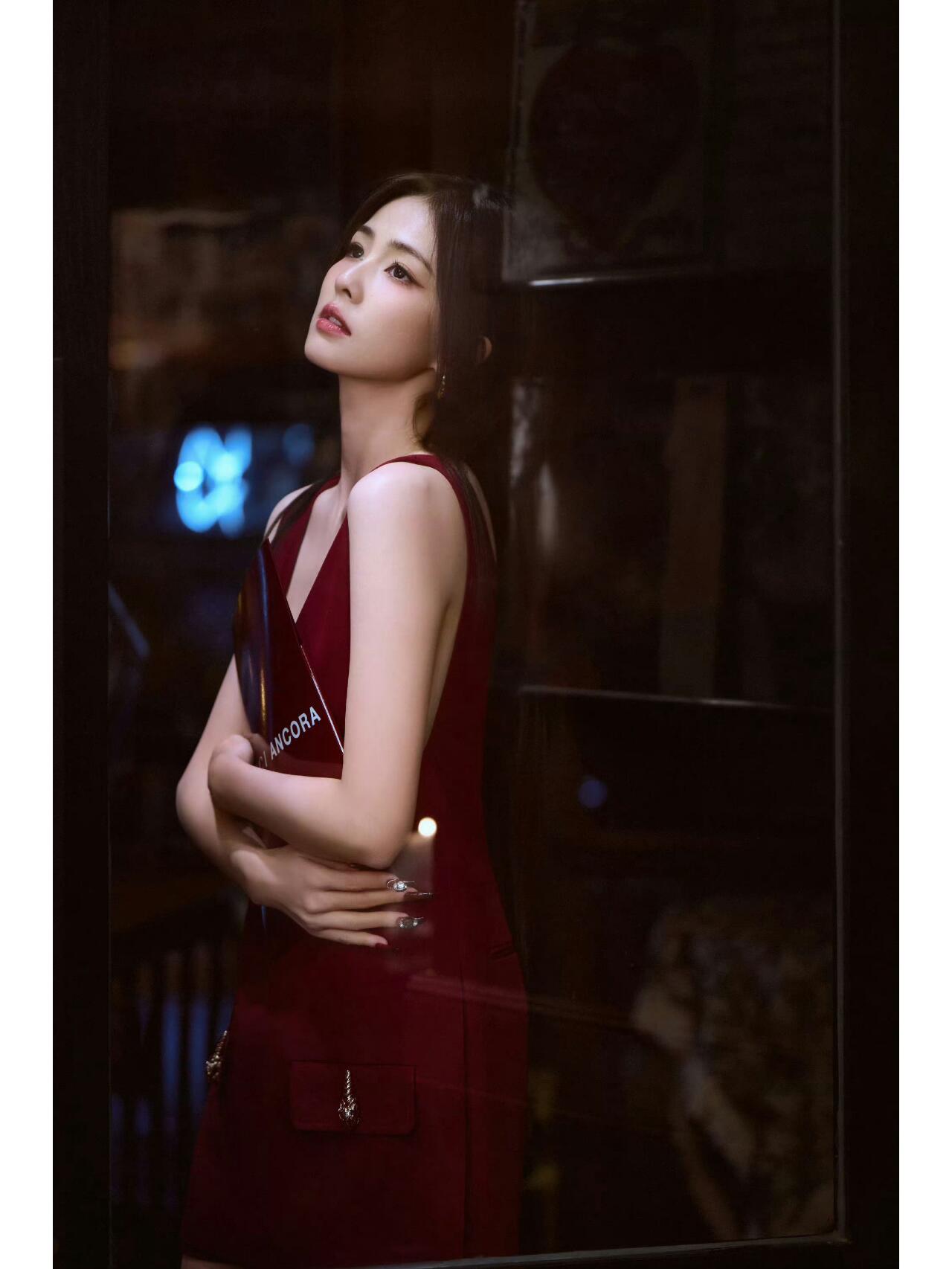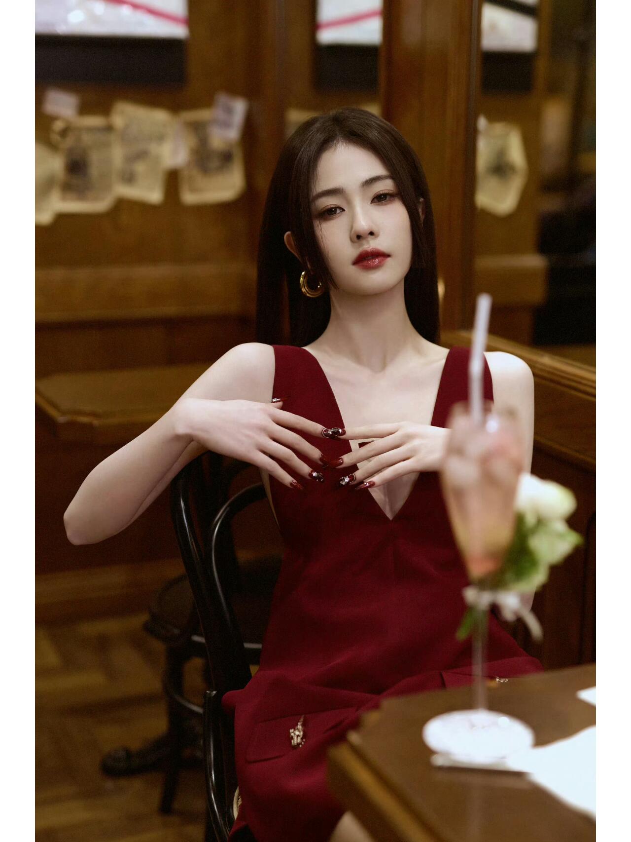 她穿了一件酒红色的无袖短款连衣裙,配黑色乐福鞋,简单利落又有青春感,同时还有一份复古的韵味.