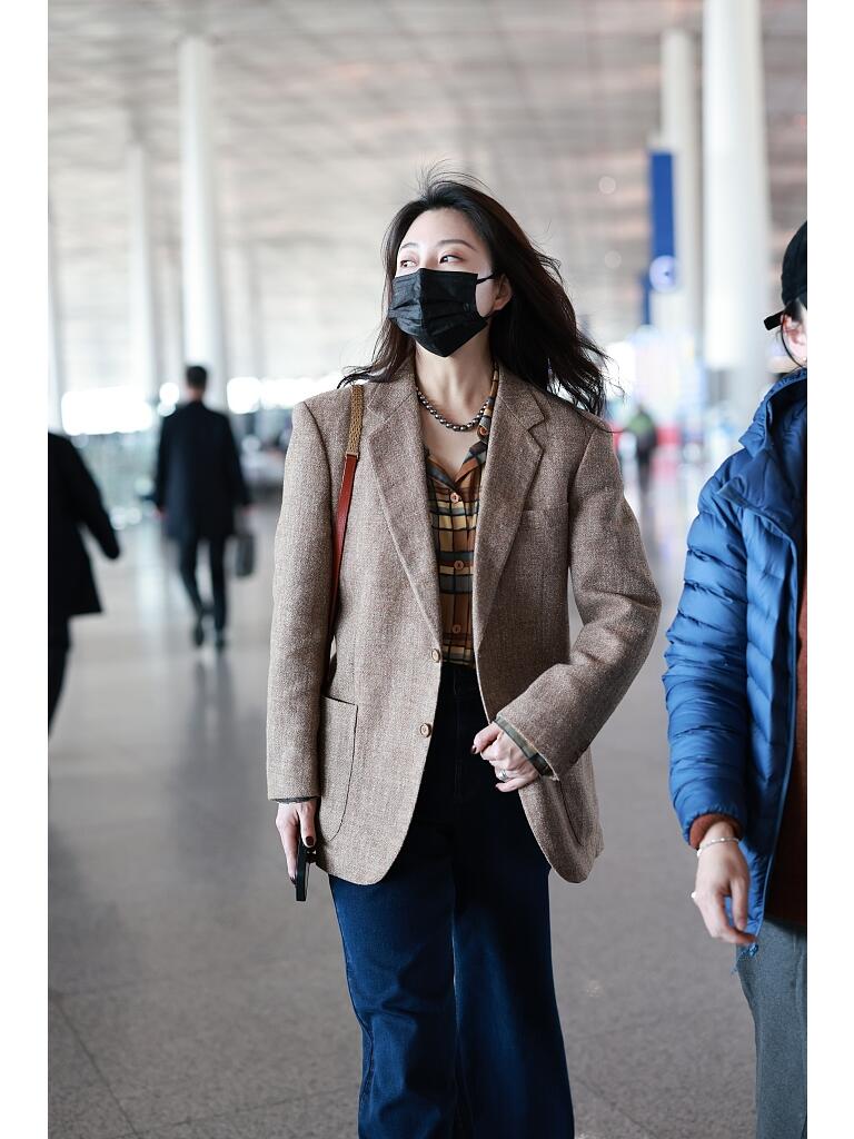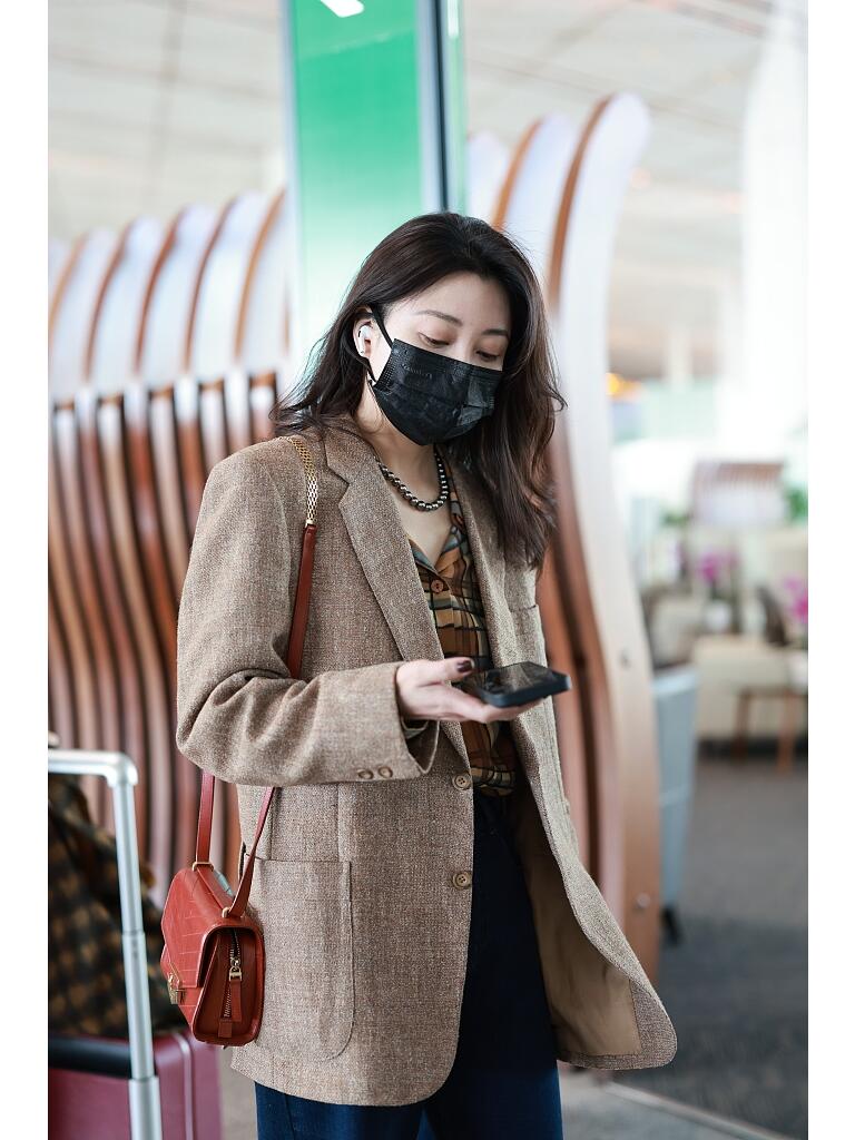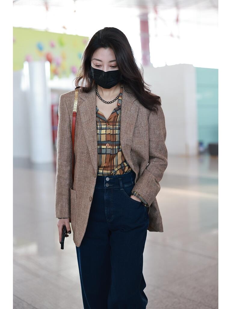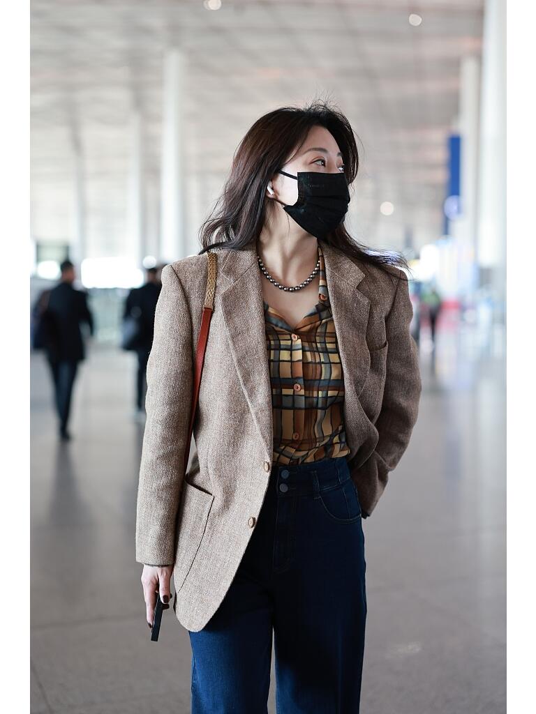 阔腿裤搭配学问大,殷桃这身灰驼西装+黑裤,简约高级!项链点睛,小细节大时尚,get起来