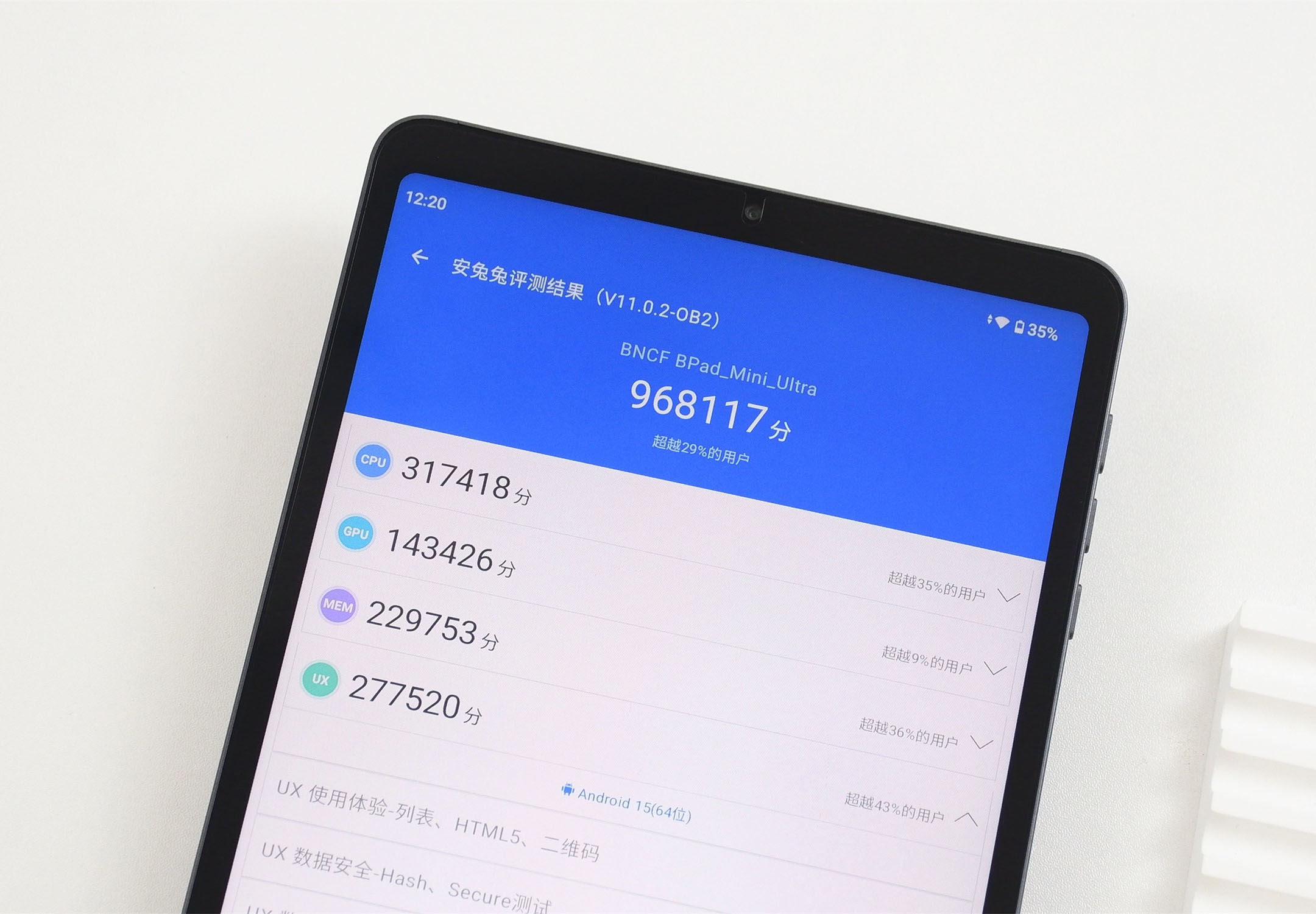 搭载了天玑7300处理器、8GB内存、256GB存储的BPad Mini Ultra,其安兔兔跑分为96万分左右。从性能层面来讲,游玩目前一些主流的手游基本没什么问题。