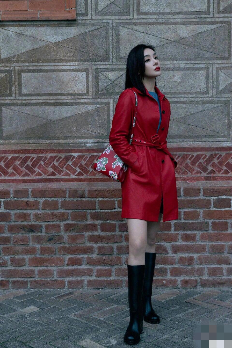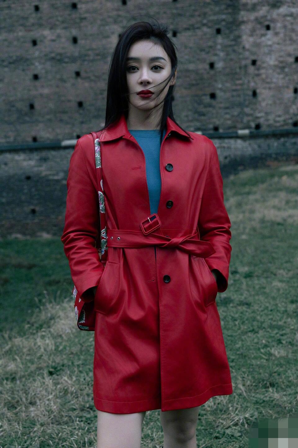 穿一件红色们皮风衣,这衣服是中长的,翻领收腰。有些衬衫连衣裙的感觉。在明媚优雅中带了一点帅气。