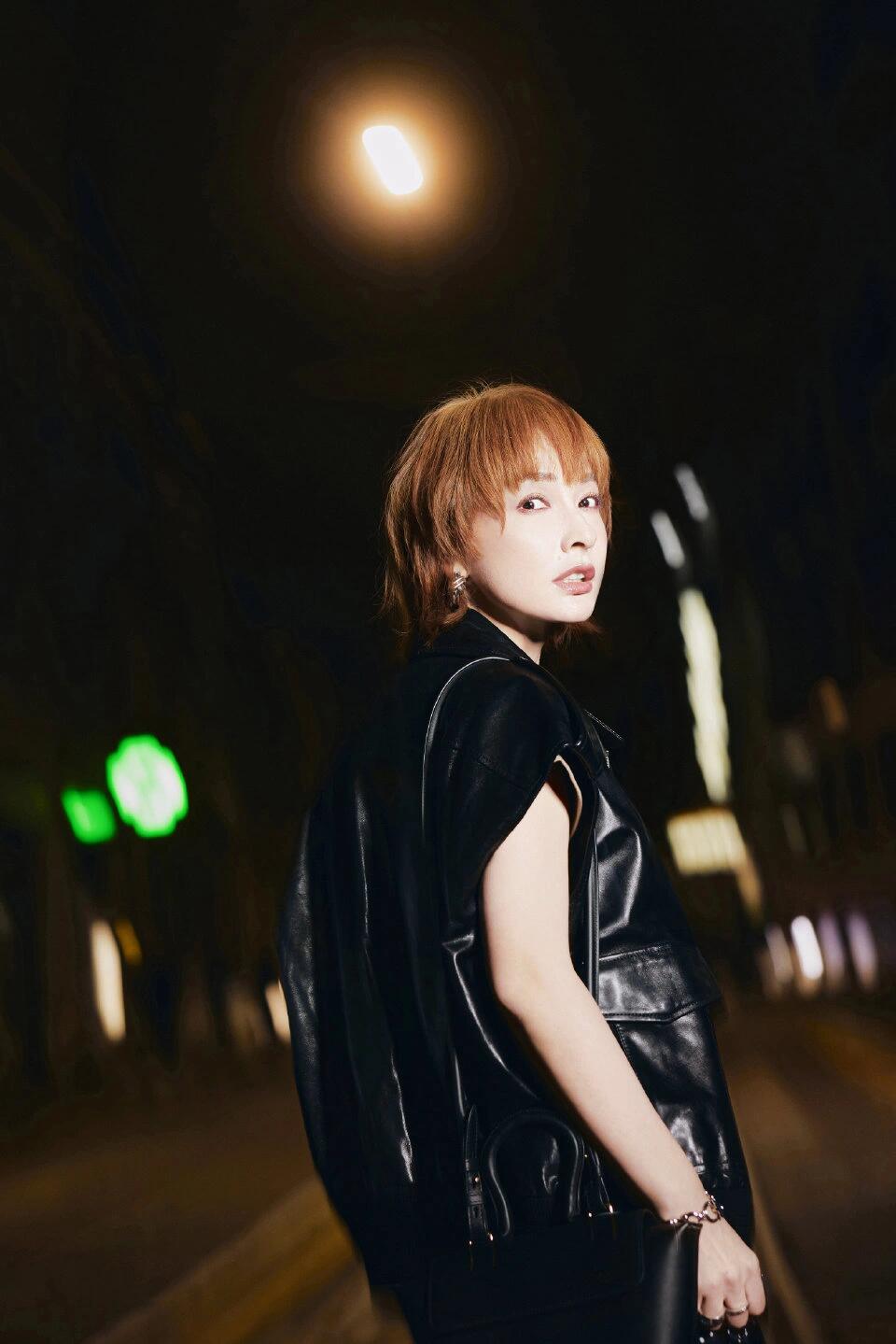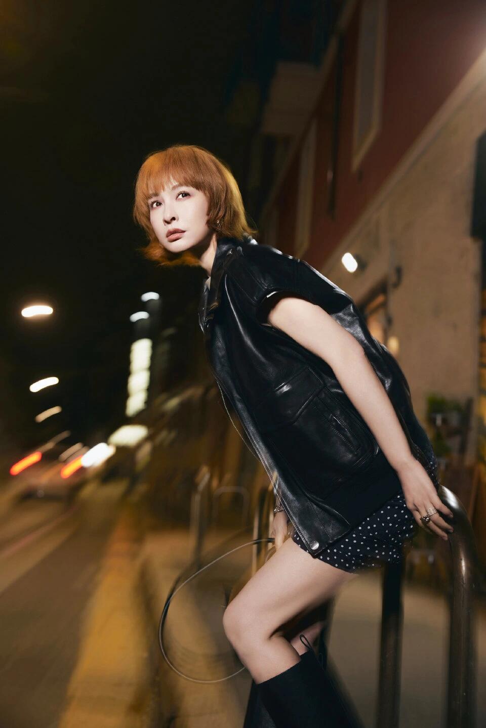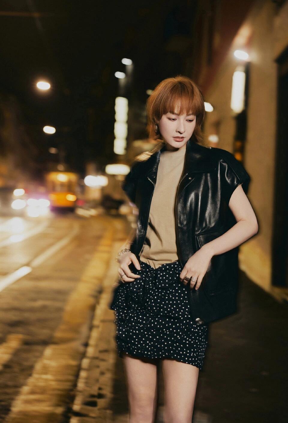 她穿一件黑色连肩短袖皮衣,内搭麦色高领短袖针织衫,配一条黑色短裙,脚踩黑色中筒靴。帅气时髦有格调。
