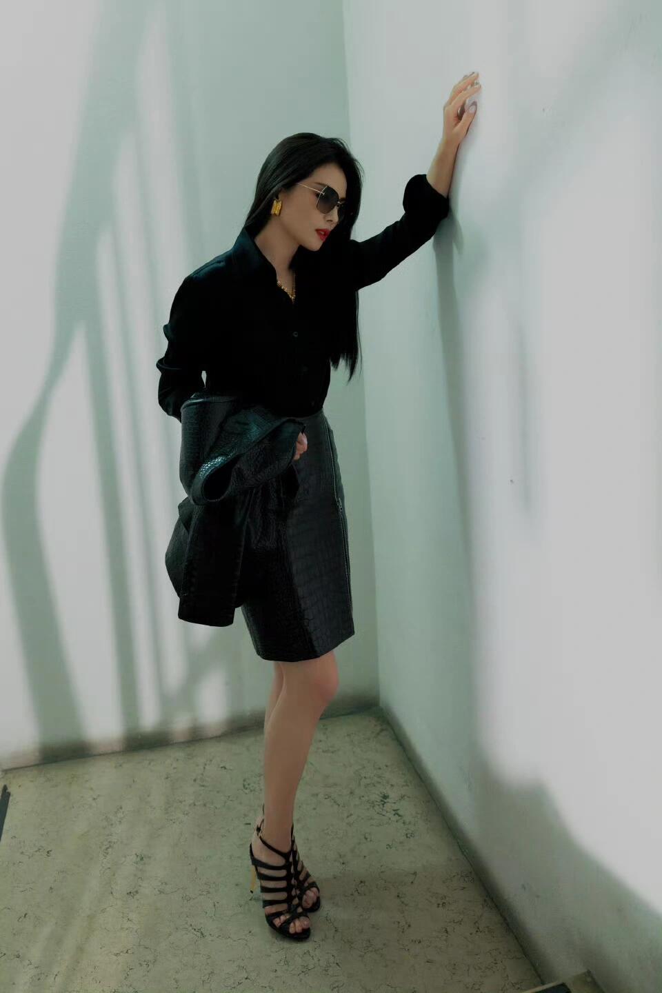 穿一件黑色短款皮衣,内搭黑色衬衫,配黑色网格面皮裙,这裙子还是斜拉链开叉裙,更增加一份酷感。脚上穿黑色罗马凉鞋。很时尚。