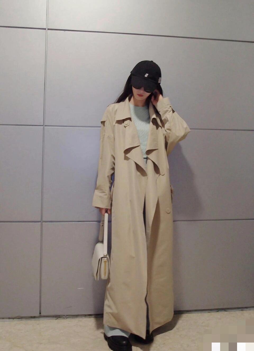 穿一件浅卡其色长款风衣,内搭浅蓝色运动风套装,配黑色鞋子。大气清爽,走路带风的样子又美又飒。