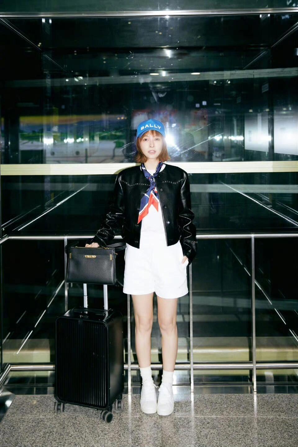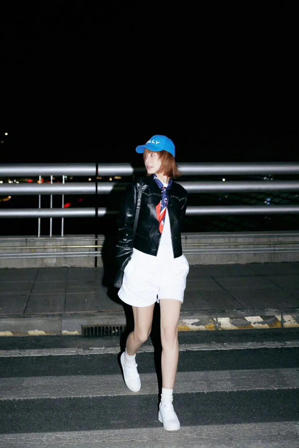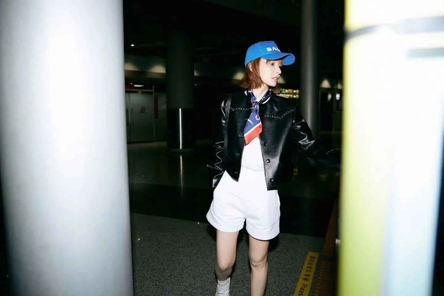 戴顶蓝色棒球帽,穿一件黑色小皮衣,内搭白色圆领衫配条白色短裤,利落时尚。很有朝气。
