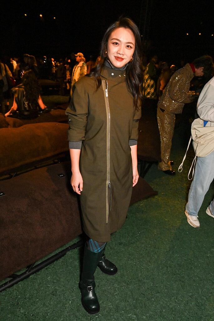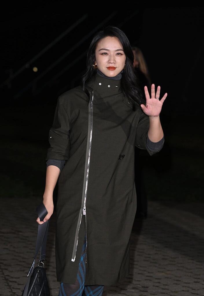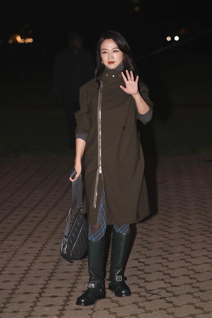 她穿了一件黑色的连衣裙.这裙子是条小立领斜拉链的休闲风连衣裙,时尚舒适又有型.