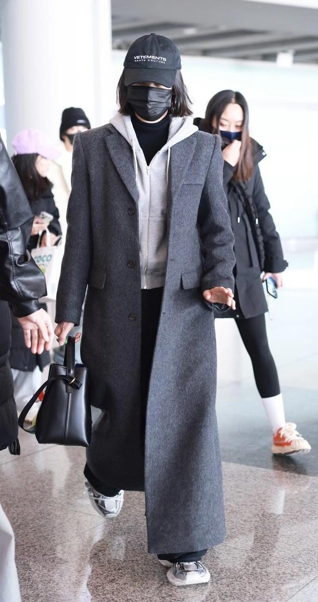 她穿了一件深灰色的长款直筒型大衣,这大衣很长,差不多过了小腿肚子.显得人很修长.