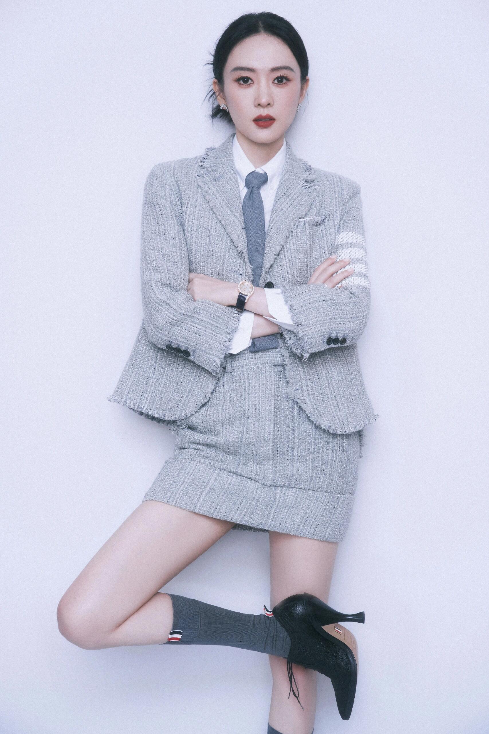 她穿了一件浅灰色的小西装,内搭白色衬衫,配一条和上衣颜色一样的短裙,配了黑色鞋子和深灰色条纹袜子。清爽简约又时髦。