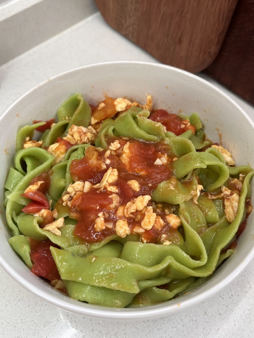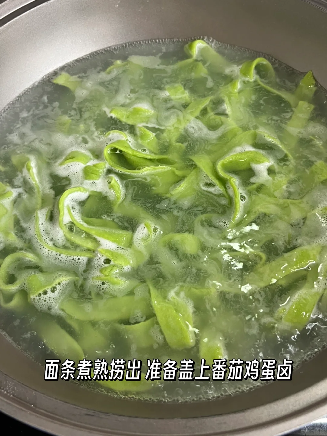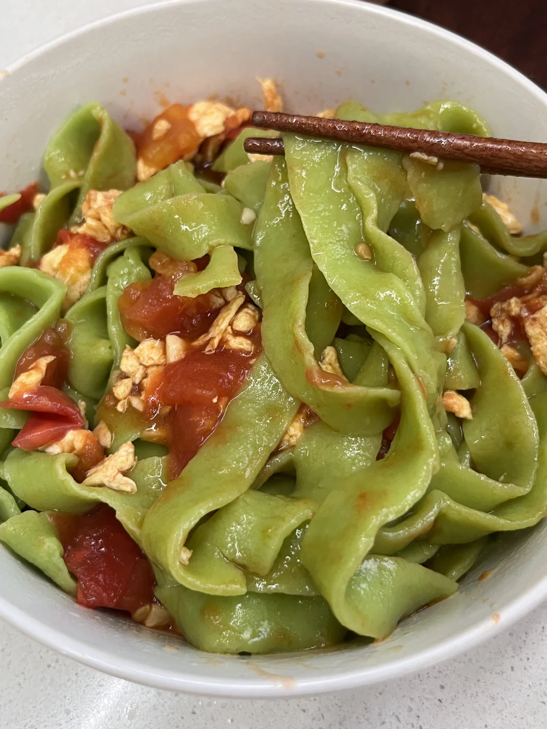 🌟做法: 1️⃣菠菜和水放料理机打碎成汁,面粉里放少许盐,少量多次加入菠菜汁,揉成稍硬面团 2️⃣盖保鲜膜,松弛半个小时,然后揉成光滑面团,擀薄成大饼,折叠切条,斗散成面条 3️⃣鸡蛋炒熟盛出,锅中爆香蒜末,放入番茄,放适量盐(先放盐出汁更快),翻炒出汁(可以再放点水 4️⃣放入鸡蛋碎,加蚝油、生抽、白糖翻炒均匀,菠菜面煮好盛出,浇上番茄鸡蛋卤✅ -